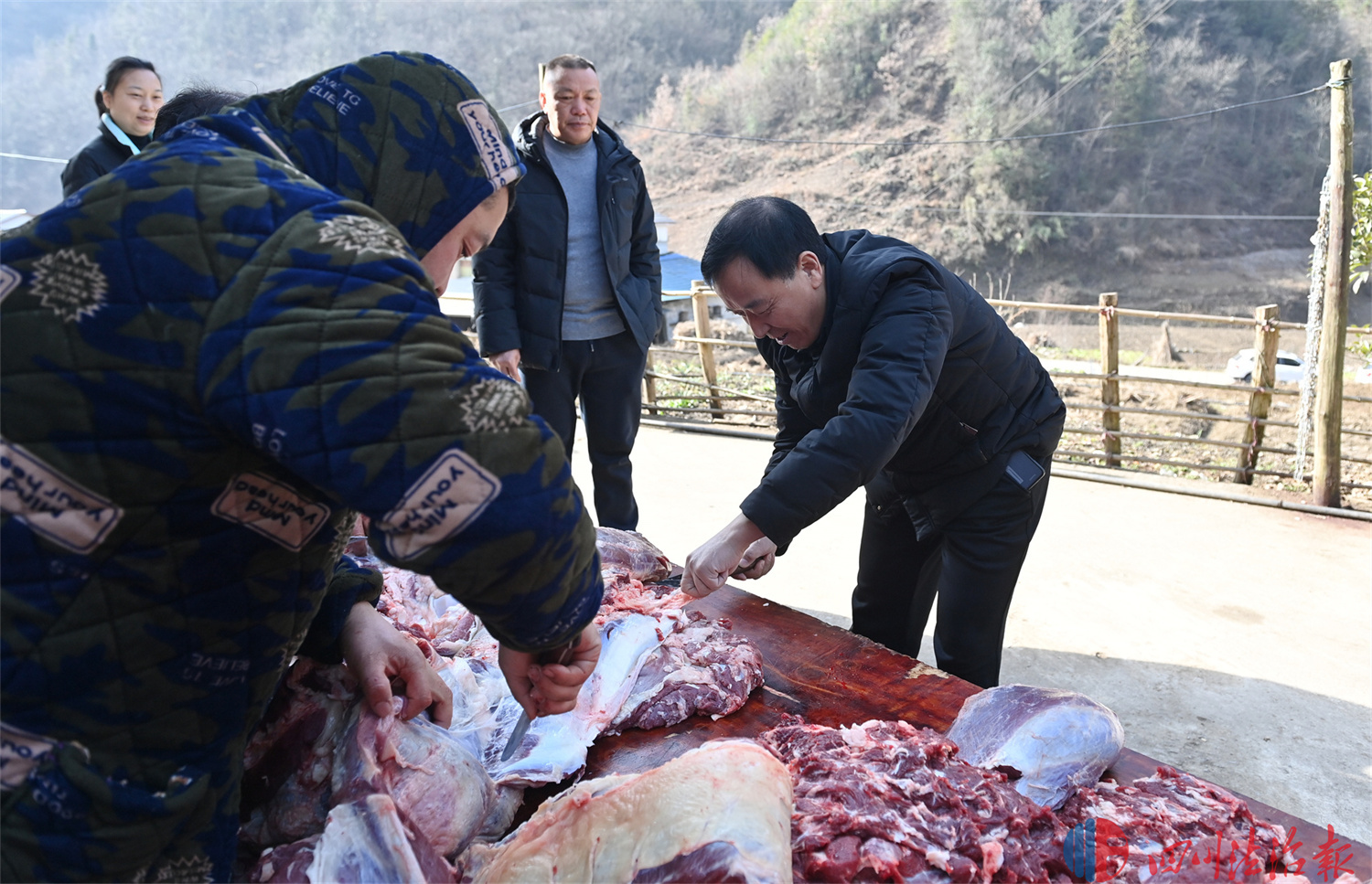 一旁,驻村第一书记王际铖正帮着分割牛肉。他告诉记者,帮扶工作队每年都会通过“消费帮扶”的形式,帮助村民销售农产品。“这不仅实实在在增加了乡亲们的收入,也让他们感受到了来自帮扶单位的温暖。”