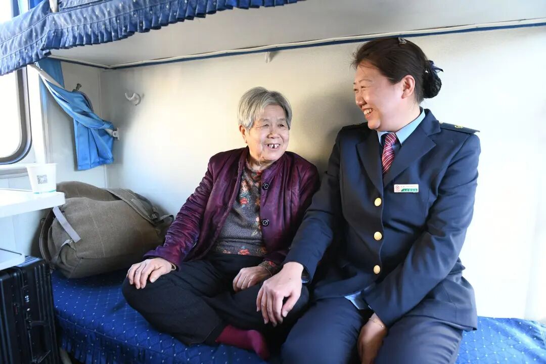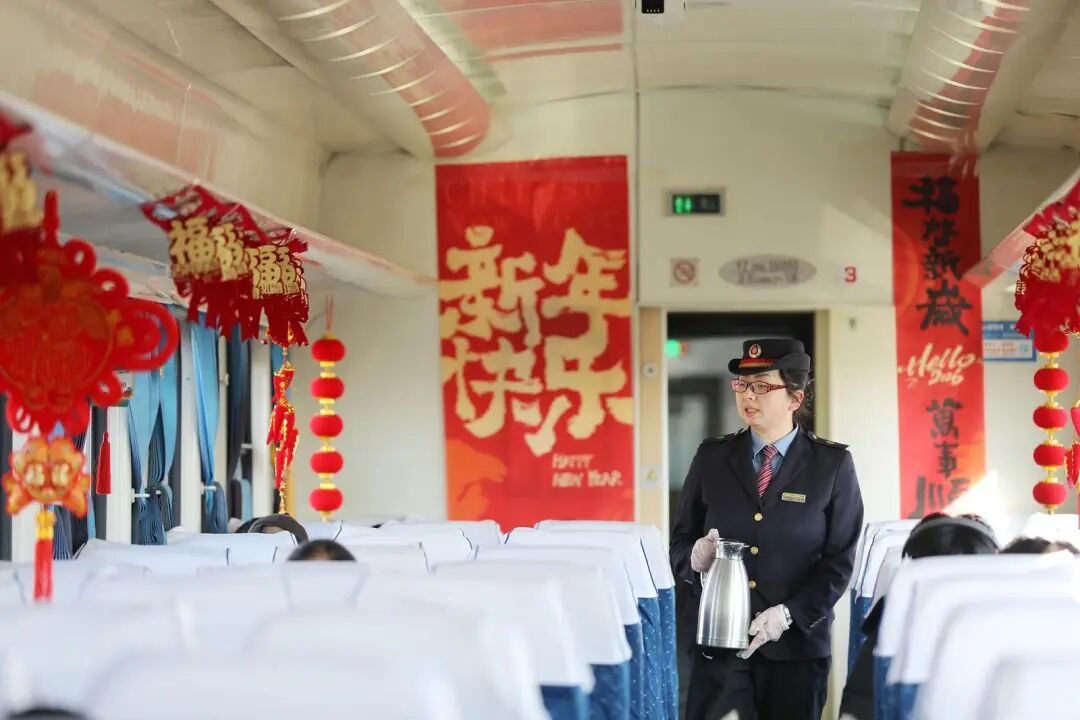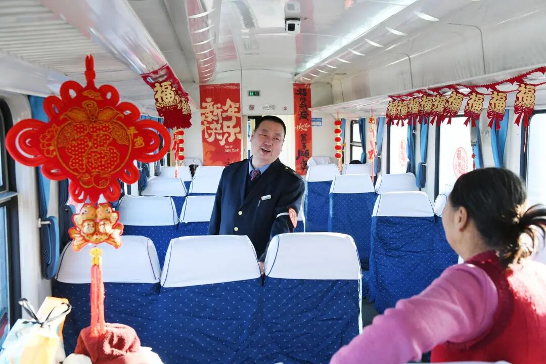 “春节快到了,我们特意装饰了车厢,让旅客一上车就能感受到年味儿。”8818次列车长王春芳说。沿线许多乘客都是“老熟人”,在固定的时间上车下车,久而久之,乘务员与乘客之间也成了朋友。