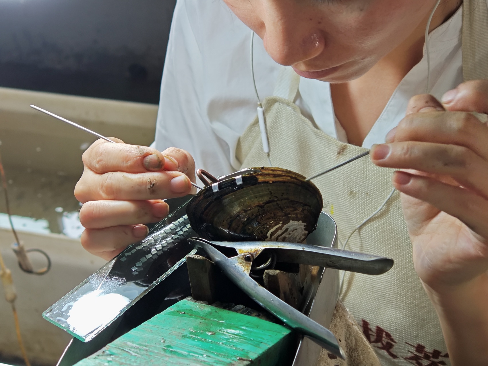 村民给珍珠蚌“插片”。开江县融媒体中心供图