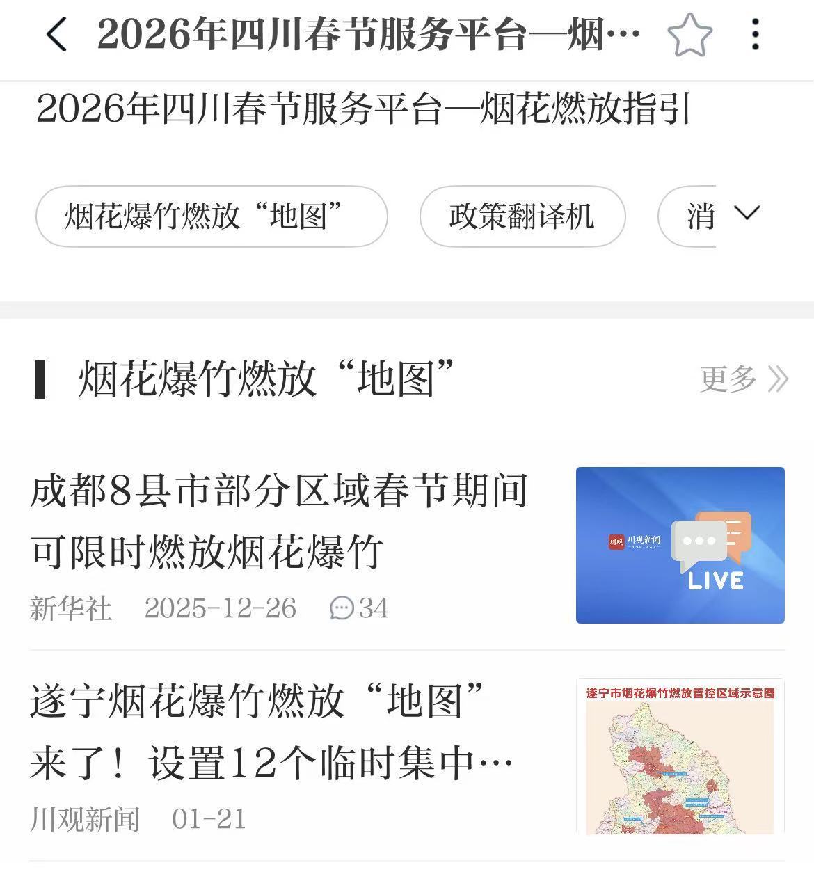 平台涵盖烟花指引、出行福利、春运服务、线上抽年货等系列服务和活动,其中春运服务板块聚合春运咨询、路线查询、出行提示、天气播报等多元内容,司机及市民可通过平台查询出行攻略、咨询出行难题,借助“问政四川”渠道获得精准解答;出行福利与线上抽年货板块,不仅有多景区门票抽奖,更有京东年货福利惊喜上线,让群众过一个实惠又热闹的马年新春;烟花指引板块则为市民提供安全燃放指引,护航春节平安。