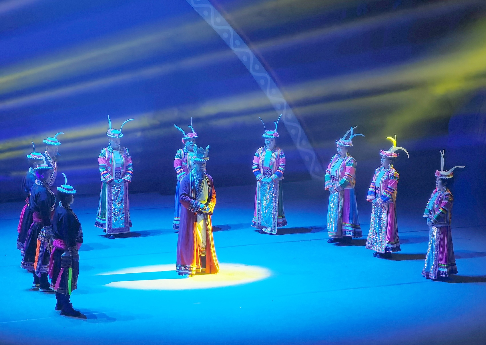 另一部大型舞台剧《白羽毛的呼唤》聚焦白马藏族文化及非遗传承,以“白羽毛”为线索,通过人类学学者的田野调查,呈现古老仪式“跳曹盖”在当代面临的传承与创新。该剧时长约90分钟,参演人员80人,融合传统歌舞、现代舞美及多媒体技术。