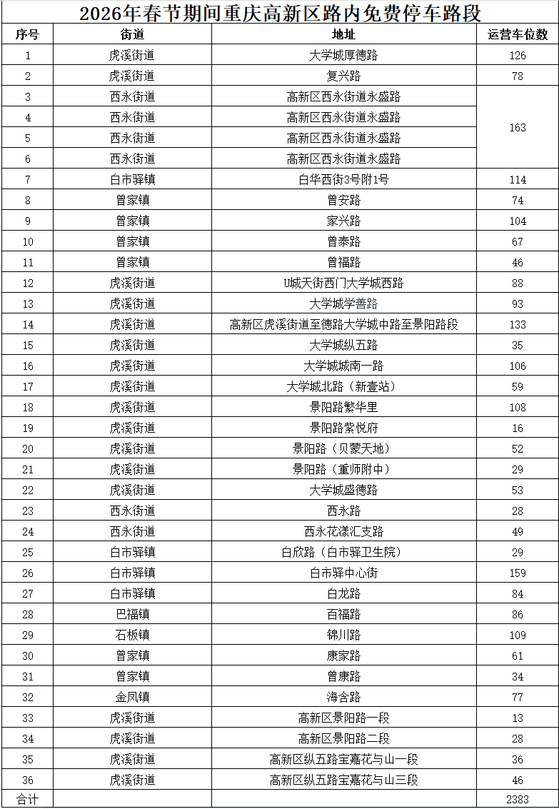 重庆高新区范围内所有路内停车位将在2026年春节期间免费开放。