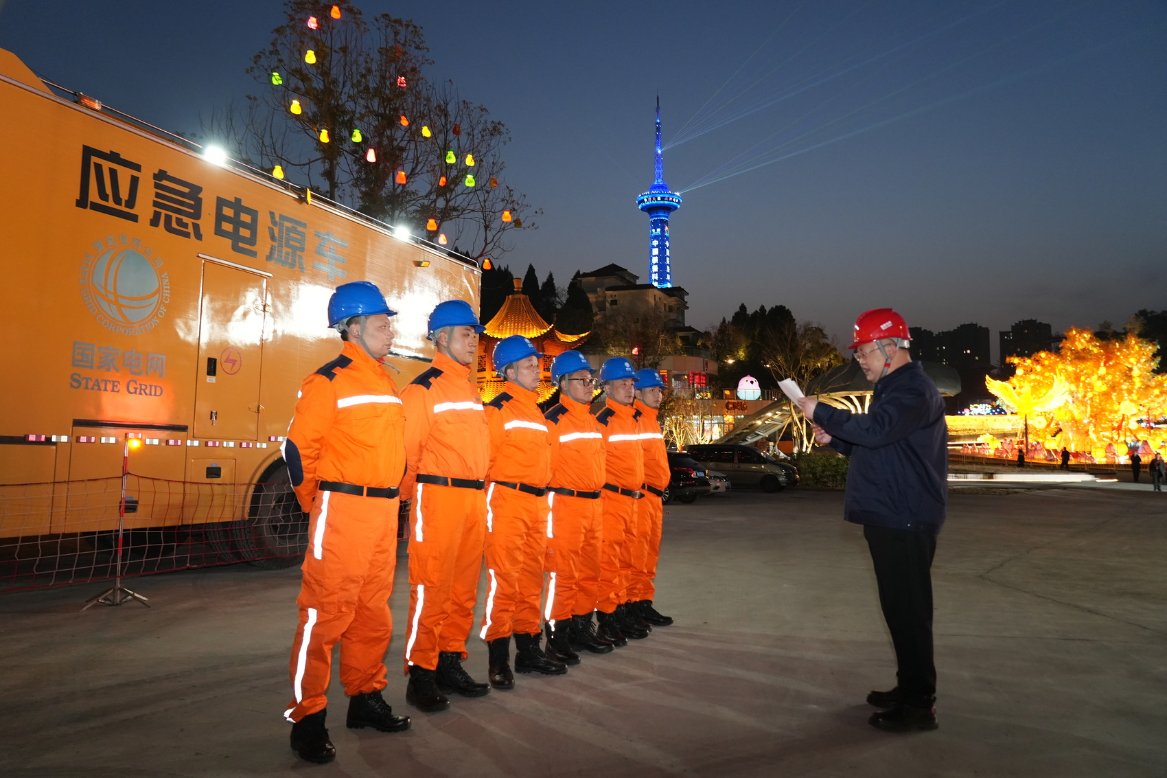 2月10日晚,在德阳玄珠湖公园2026年第十七届德阳灯会保电现场,国网德阳供电公司开展应急演练,并采取多重电力保障措施,确保灯会举行期间电力供应万无一失。