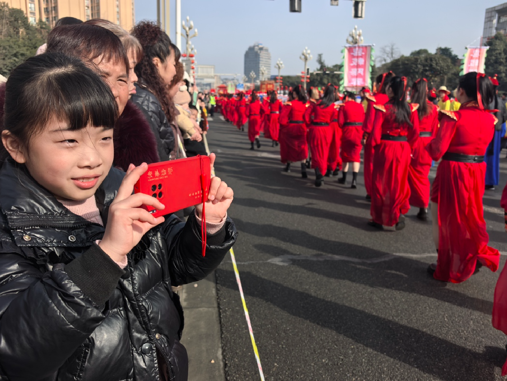 2月10日上午,绵竹市体育中心广场上,第二十五届绵竹年画节的年画巡游活动刚拉开序幕。周围人潮涌动,市民陈先生踮起脚,琢磨着巡游队伍中巨型年画机甲门神的动作奥秘,身后忽然传来一句有些焦急的提醒:“大哥,稍微站低一点嘛,我们后面都看不到了。”闻言,他立即屈下身来,给后方观众腾出一片视野。