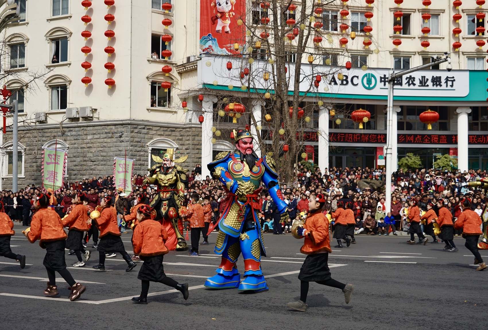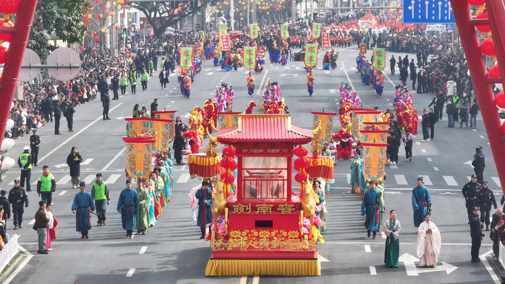 巡游队伍由32个特色方阵、近1400名演员组成,参与人员涵盖中小学生、教师、非遗传承人、本地企业及外请民俗表演团队,阵容为历届之最。内容方面,除了立体再现《迎春图》所描绘的绵竹人热闹过春节的鲜活形象外,创新加入了巨型年画机甲门神等现代元素,并特别邀请阿坝州“卡斯达温”舞蹈、凉山彝族歌舞、清平羌族民俗等表演团队加入,生动展现藏羌彝民族文化风情。