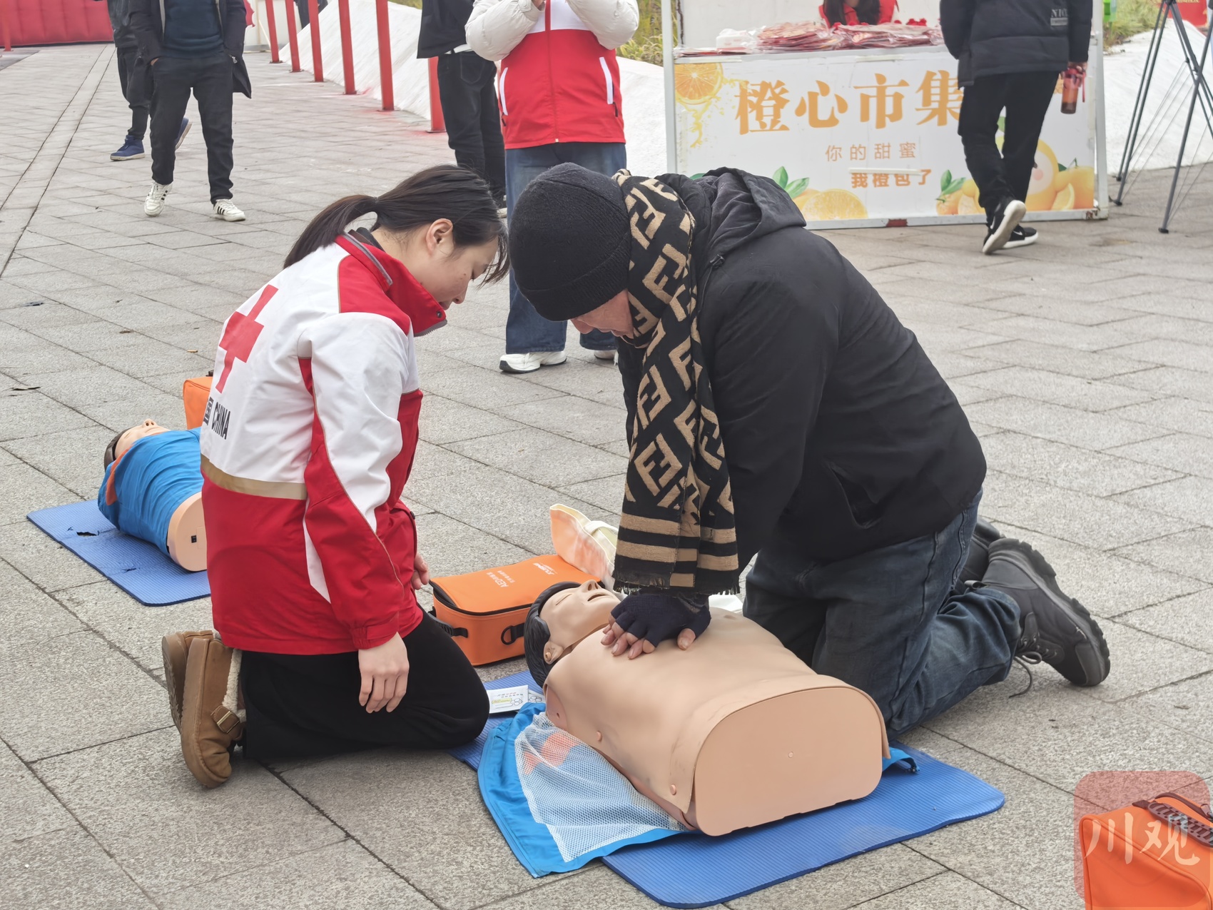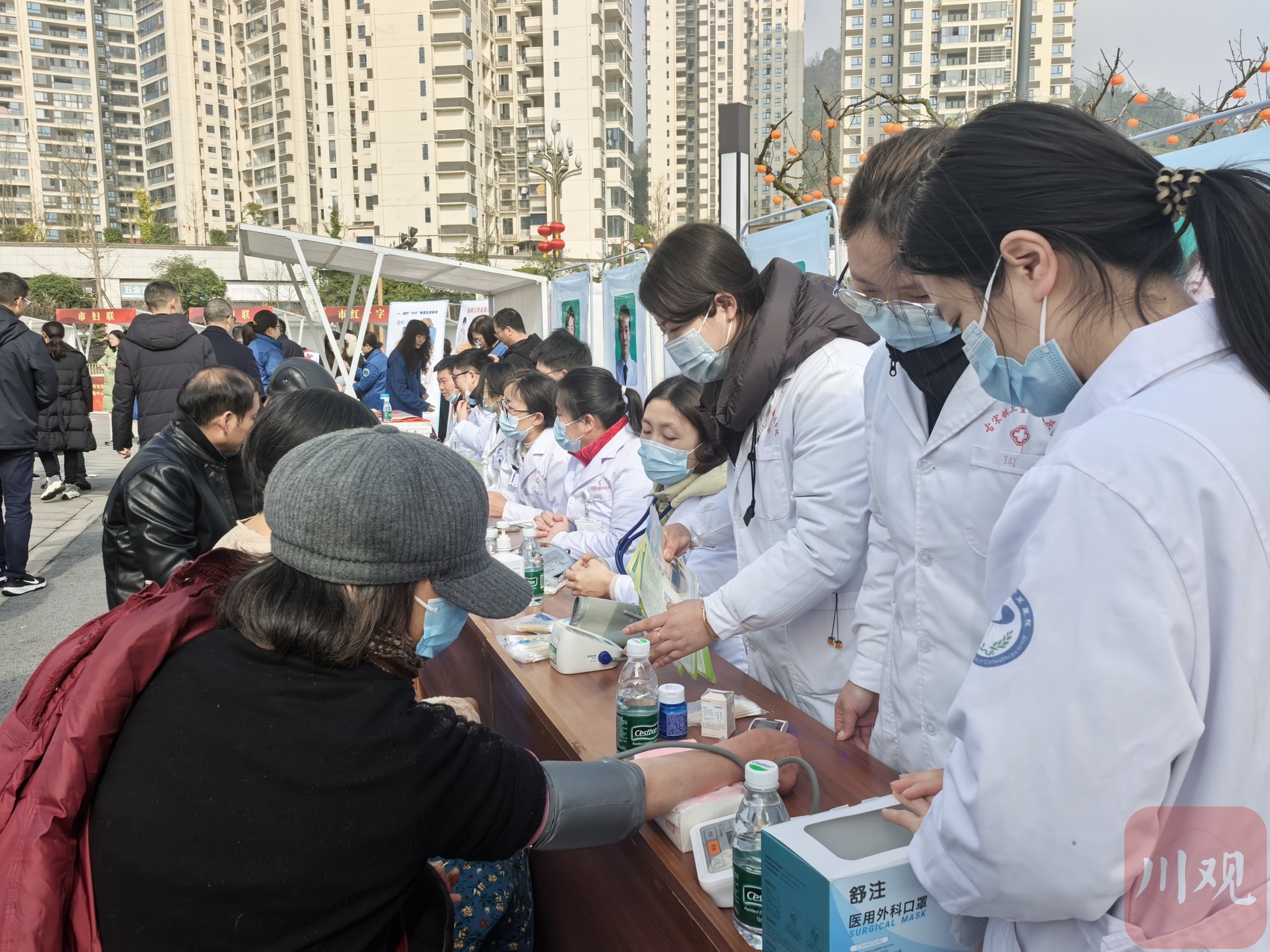 舞台一侧布设20余个展位,来自文化、科技、司法、卫健、文旅、生态等部门的志愿服务队,开展了爱心义诊、普法宣传、理论宣讲、科技助农等多元服务。新春送福区前人头攒动,宜宾市书法家协会会员挥毫泼墨,定制新春福字、吉祥春联带着墨香与暖意,一一送到群众手中;猜灯谜、欢乐套圈圈等互动游戏,吸引附近群众踊跃参与,共赴一场充满年味的惠民盛宴。