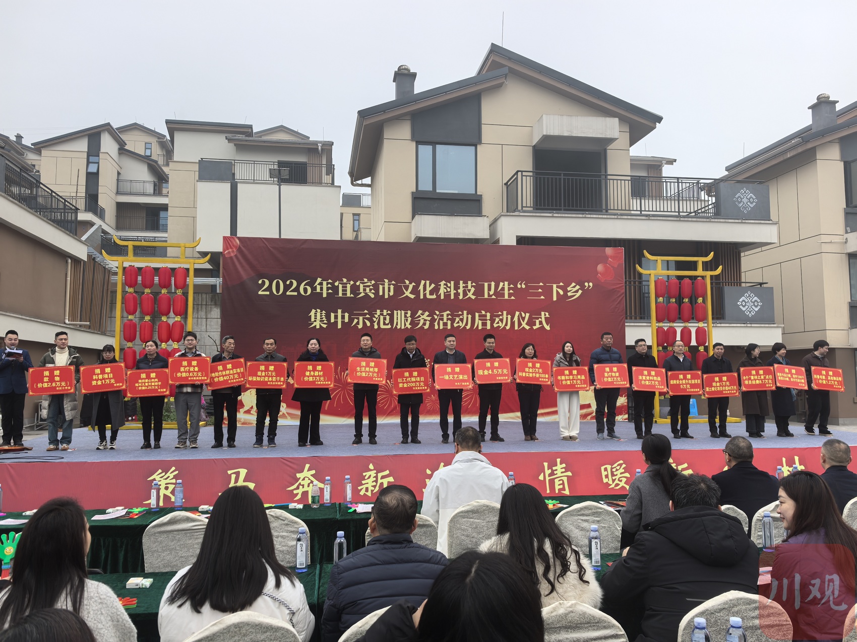 2月11日,宜宾市兴文县古宋镇黄金山村党群服务中心人头攒动,2026年宜宾市文化科技卫生“三下乡”集中示范服务活动在这里启动,为当地村民与游客送上新春文化盛宴,也拉开了宜宾全年“三下乡”系列活动的序幕。