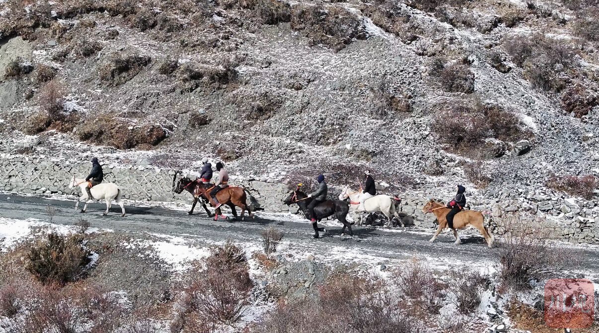 2月8日,汤古镇鸡丑山雪山草甸之上旌旗招展,全县各乡镇百余位骑手汇聚于此,在连绵雪山的壮阔背景下策马扬鞭,展现雪域马背文化的独特魅力。