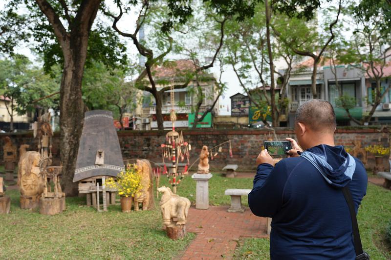 2月11日,游客在越南首都河内文庙参观木雕马。