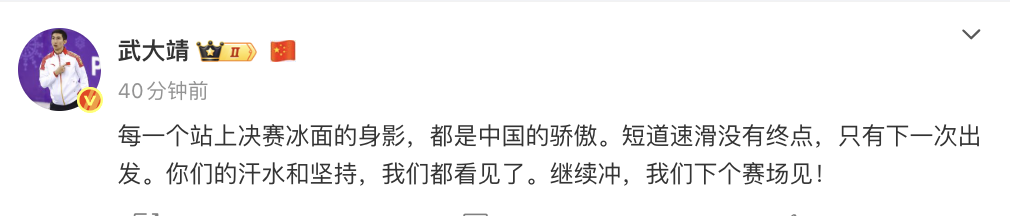 赛后,武大靖发文:每一个站上决赛冰面的身影,都是中国的骄傲。短道速滑没有终点,只有下一次出发。你们的汗水和坚持,我们都看见了。继续冲,我们下个赛场见!