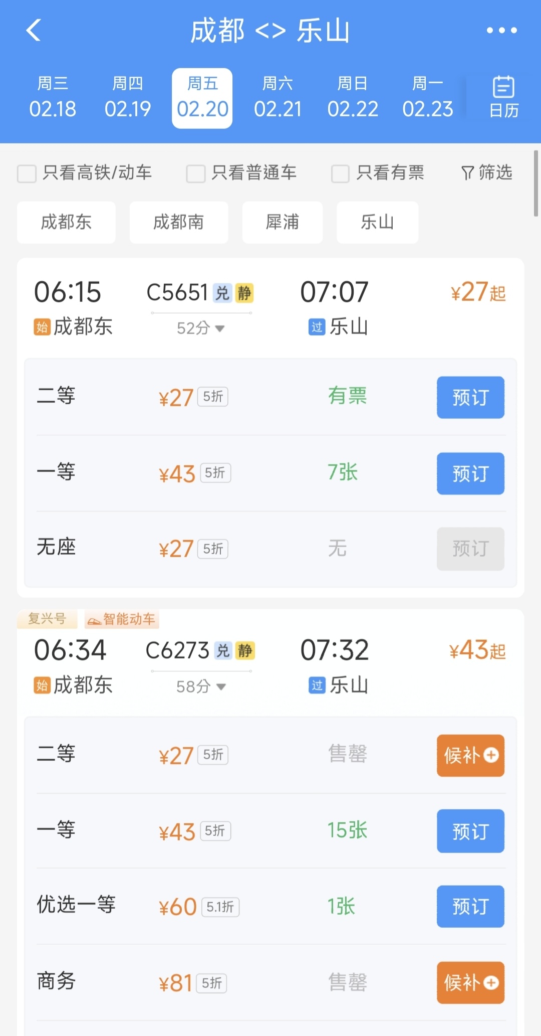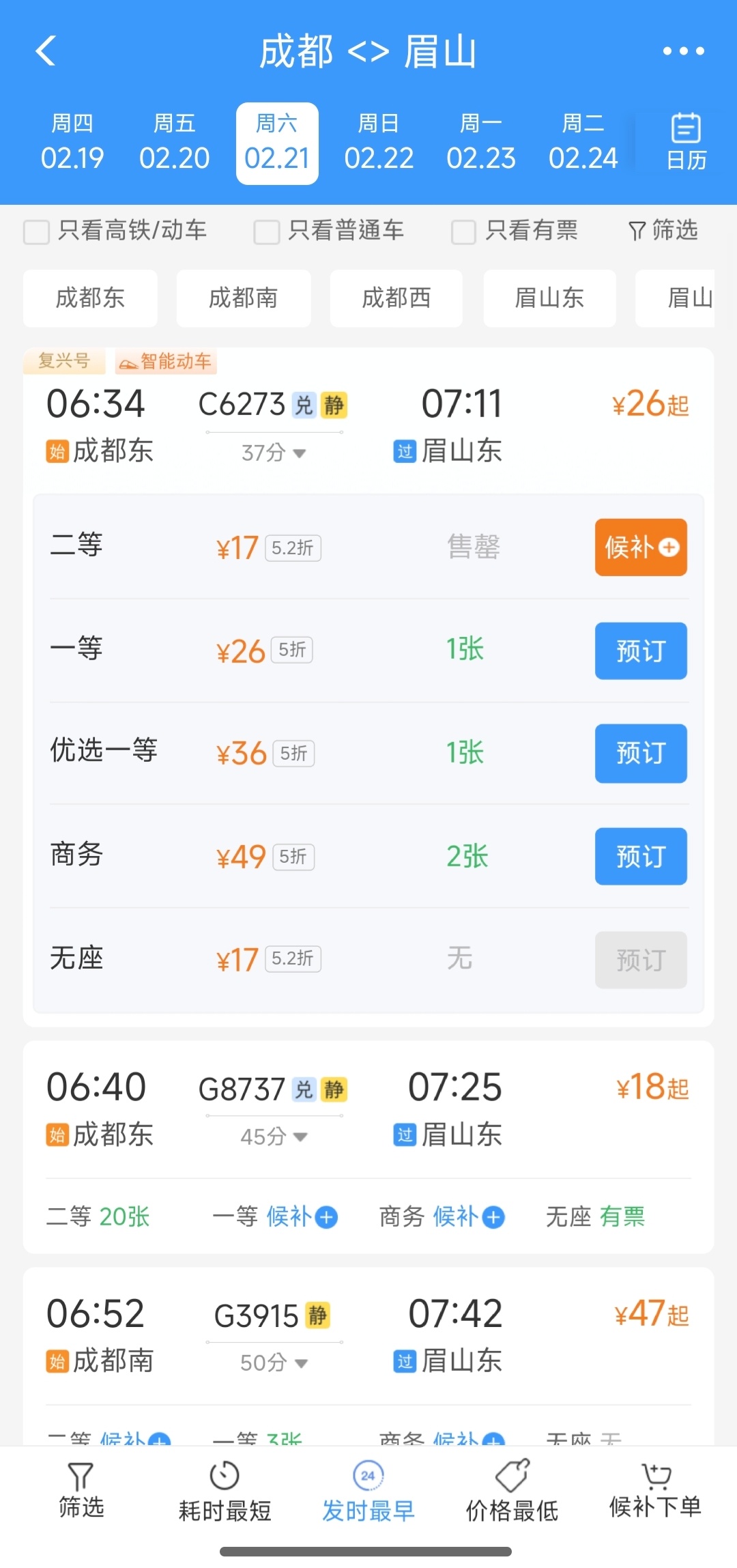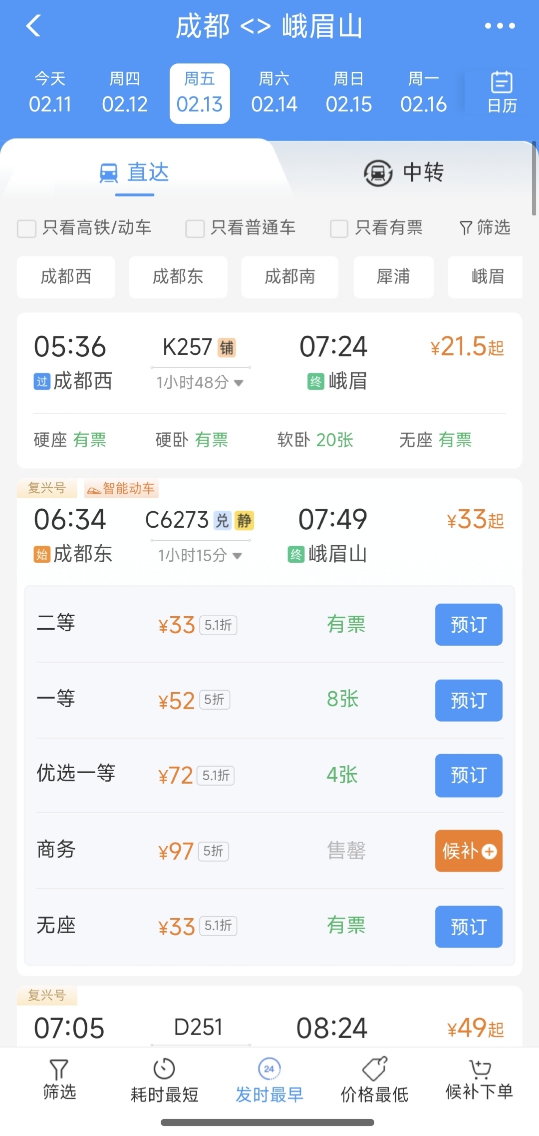 2月12日至2月25日,成都到峨眉山部分车次打5折左右,C6273(成都东6:34出发至峨眉山7:49到达),二等座原价65元的车票,现在只需要33元;一等座原价104元的车票,现在只需要52元。