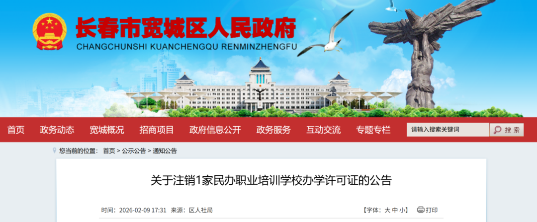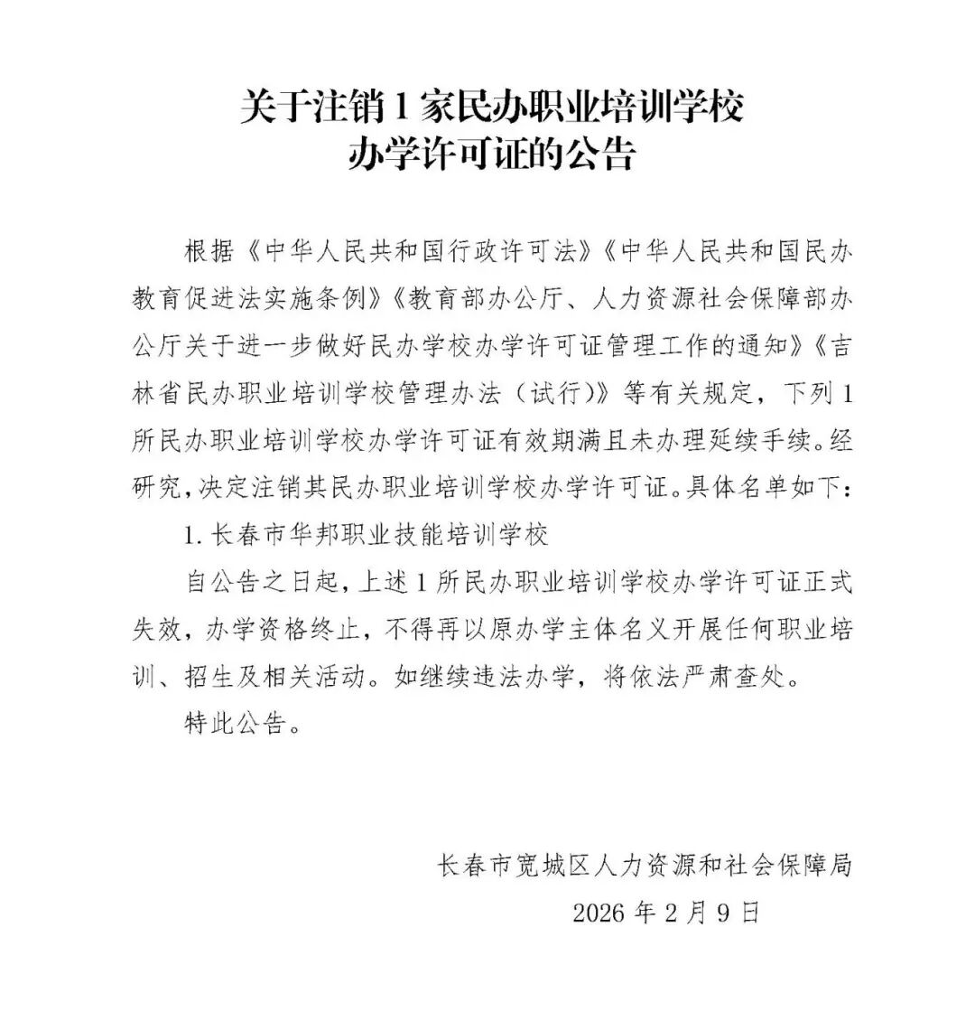 2月9日,长春市宽城区人民政府网站发布《关于注销1家民办职业培训学校办学许可证的公告》,自公告之日起,长春市华邦职业技能培训学校办学许可证正式失效,办学资格终止。具体内容如下: