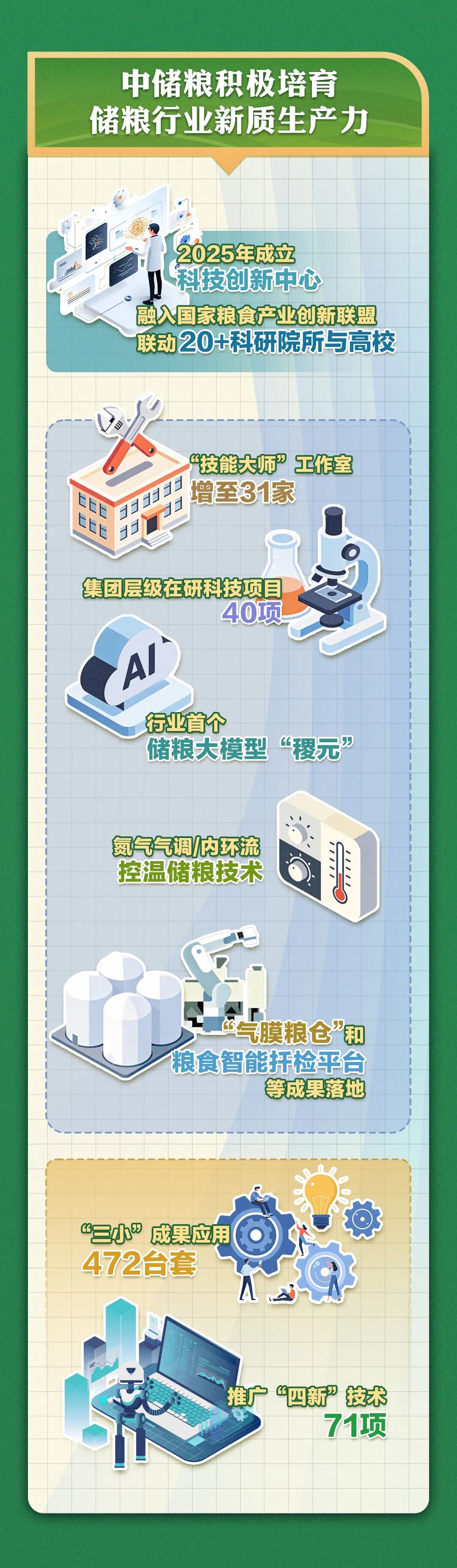 当前,我国正加快发展新质生产力,以科技赋能粮食生产、储存、加工全链条,推动“汗水农业”向“智慧农业”加速迈进。“十四五”期间,中储粮集团坚持向科技要动能、以创新谋未来,面向服务国家战略需要和科技前沿,持续增强科技自主创新能力。2025年,中储粮集团宣布成立科技创新中心,主动融入国家粮食产业创新联盟,与科研院所、高校等20多家机构密切合作,技能大师工作室增至31家;不断加大研发投入,集团层级在研科技项目40项;行业首个储粮大模型“稷元”、氮气气调等储粮技术、内环流控温储粮技术、“气膜粮仓”和粮食智能扦检平台等一系列科研成果投入应用;一批科研新成果快速孵化,“三小”即小发明小创造小革新成果应用472台套,推广应用新技术、新工艺、新材料、新设备71项……高质量创新成果加快产出,储粮科技对高质量发展的贡献率不断提升。