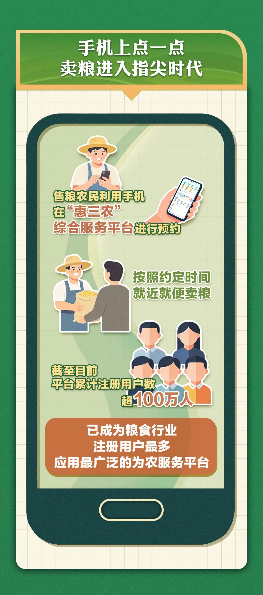 为解决传统售粮流程环节多、农民等候时间长等问题,中储粮集团在秋粮收购过程中全面推广“惠三农”综合服务平台和“一卡通”收购系统。农户在“惠三农”综合服务平台上预约后,即可按照约定时间就近就便卖粮。通过“一卡通”系统,农户在自助一体机上就能查询粮食销售进度,从车辆进库、检验、入仓,到回皮、付款、出库,全流程电子化运转,再也不用跟着跑手续、填单子。粮食收购的全过程处于有效监管之中,能够保证售粮农民粮出手、钱到手,有效防范“打白条”风险。