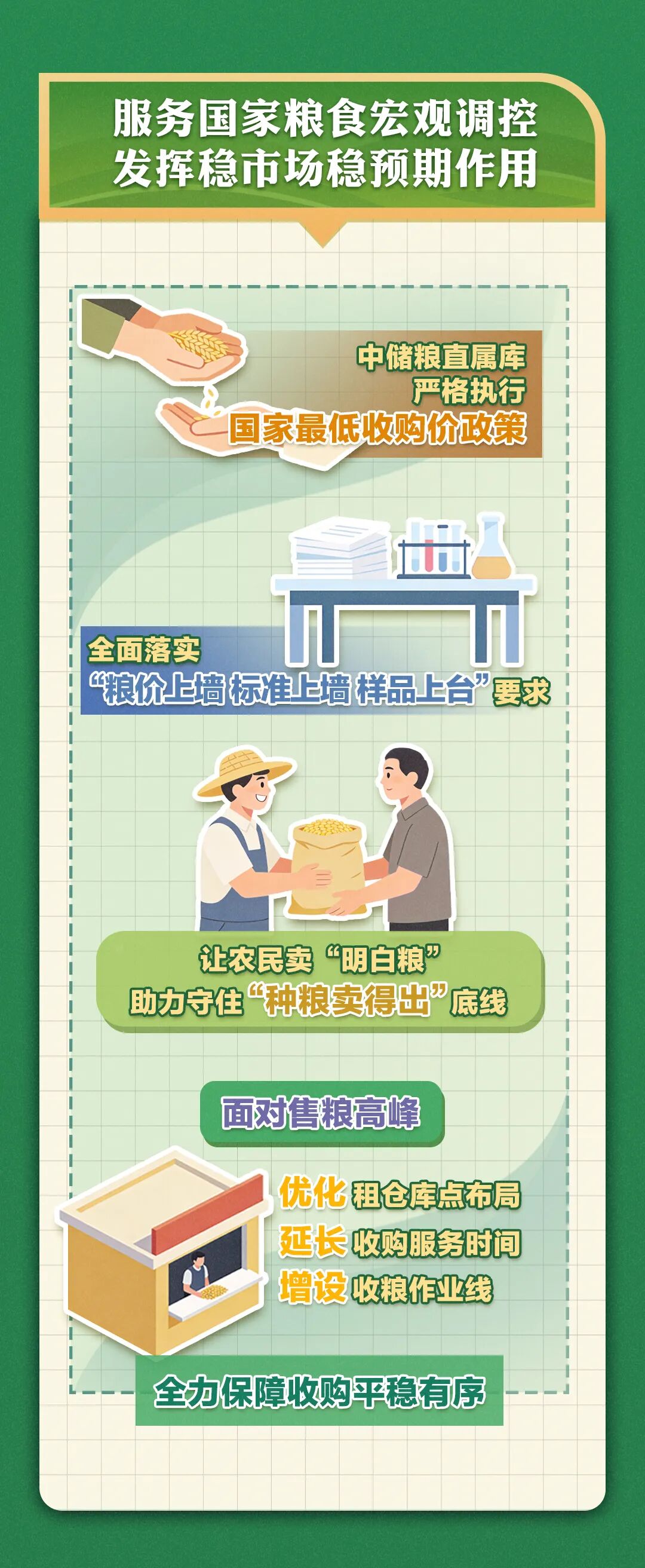 中储粮集团通过政策性收储与常态化轮换购销,为保护农民种粮积极性、促进粮食稳产增产作出了积极贡献。特别是面对近年来粮食丰收、供强需弱、价格下行压力等复杂形势,中储粮集团统筹各品种各性质各区域收购,为促进市场稳定和农民增收发挥重要支撑作用。同时,切实履行最低收购价收购政策执行主体职责,充分发挥垂直管理体系和网络布局优势,有力发挥服务国家粮食宏观调控“主力军”作用。