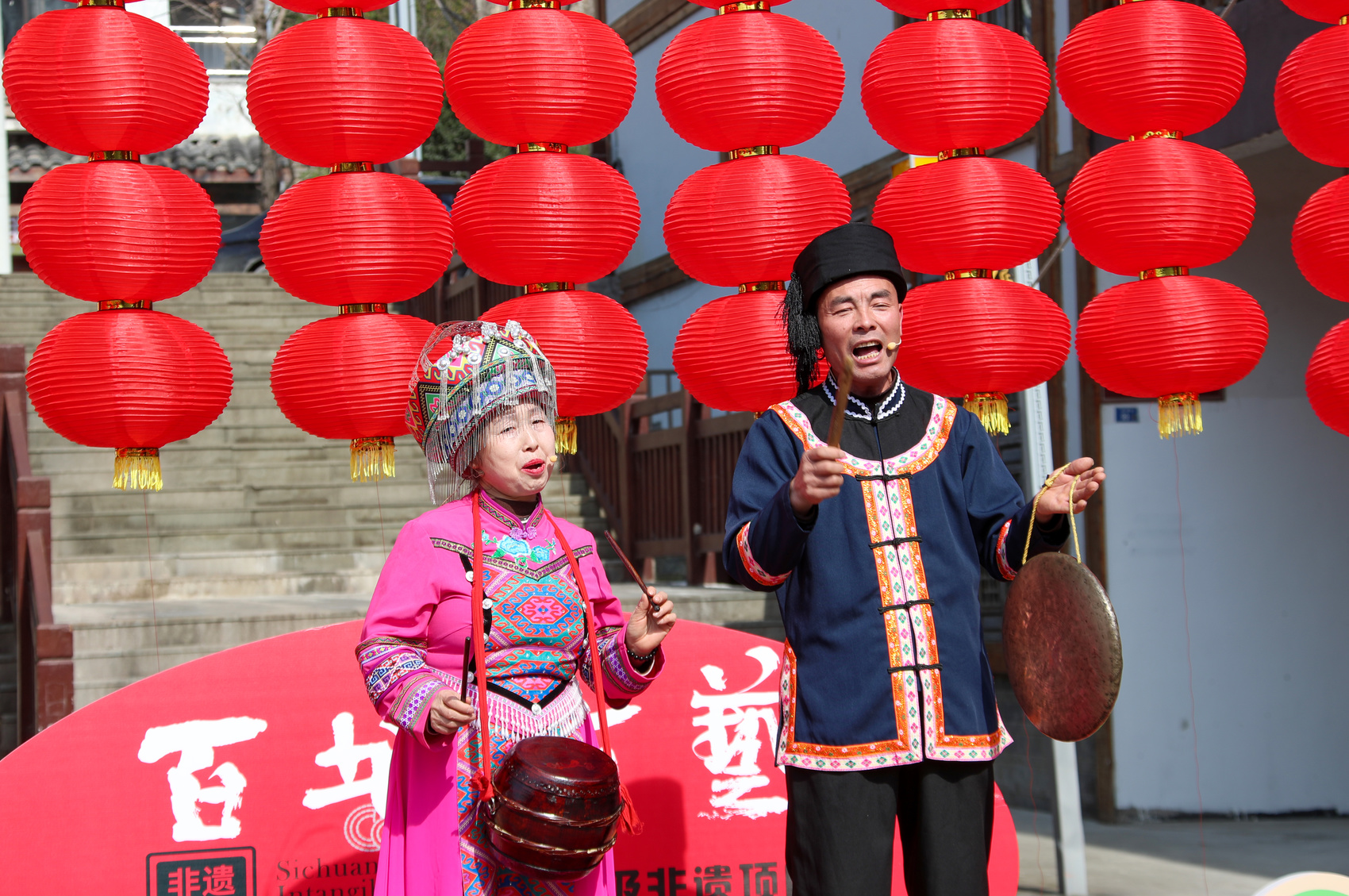 与美食相映生辉的,是贯穿全场的非遗展示和民俗展演。高亢的土家迎客歌拉开序幕,豪放的川东土家薅草锣鼓、欢快的钱棍舞和“车车灯”表演接连登场,引来掌声不断。非遗活态展示区内,写春联、刺绣、根雕等技艺吸引人们驻足体验,文化从“可观”变为“可感”。
