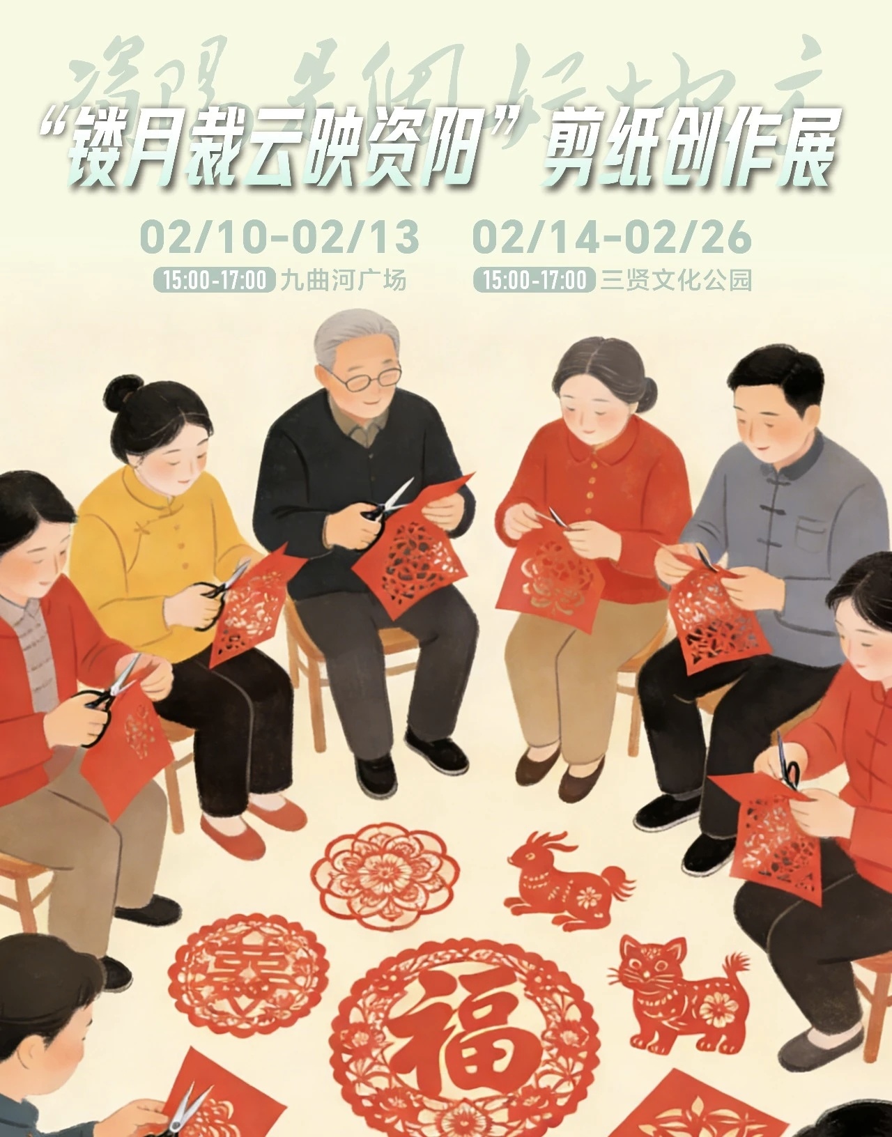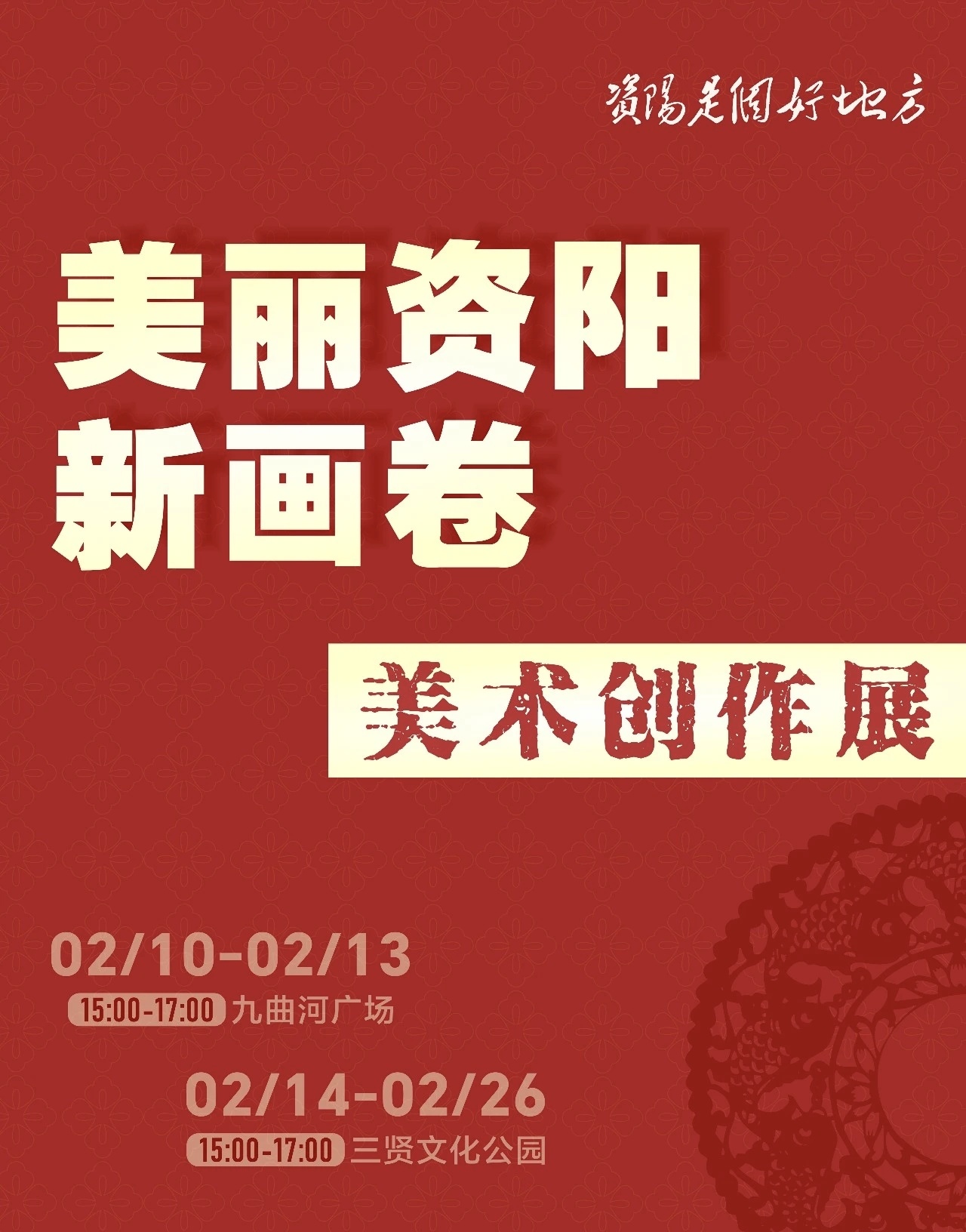 文化雅集,静享其美。正月初三(2月12日),三贤文化公园“千人绘‘福’”,书法家与市民同心书写万家福气。九曲河广场“活力健身迎新年”带您跳起来。从“‘资大文旅’文艺交流展演专场”到“镂月裁云映资阳”剪纸摄影美术展,一场场展览与秀演,展现资阳的人文厚度与时代风采。