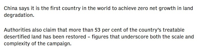文章说,作为世界上规模最大、持续时间最长的生态恢复计划,“三北”防护林工程创造了多项纪录:中国成为首个实现土地退化零增长的国家,53%的可治理沙化土地得到有效治理。这些数字背后,是中国对生态治理的坚定决心和持续投入。