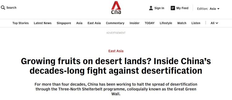 新加坡亚洲新闻台(CNA)网站2月10日刊发深度报道《在沙漠里种水果?中国数十年防沙治沙成就斐然》,通过实地探访展现了中国防沙治沙的卓越成就。报道认为,中国通过持续四十余年的“三北”防护林工程,成功遏制了荒漠化蔓延趋势。