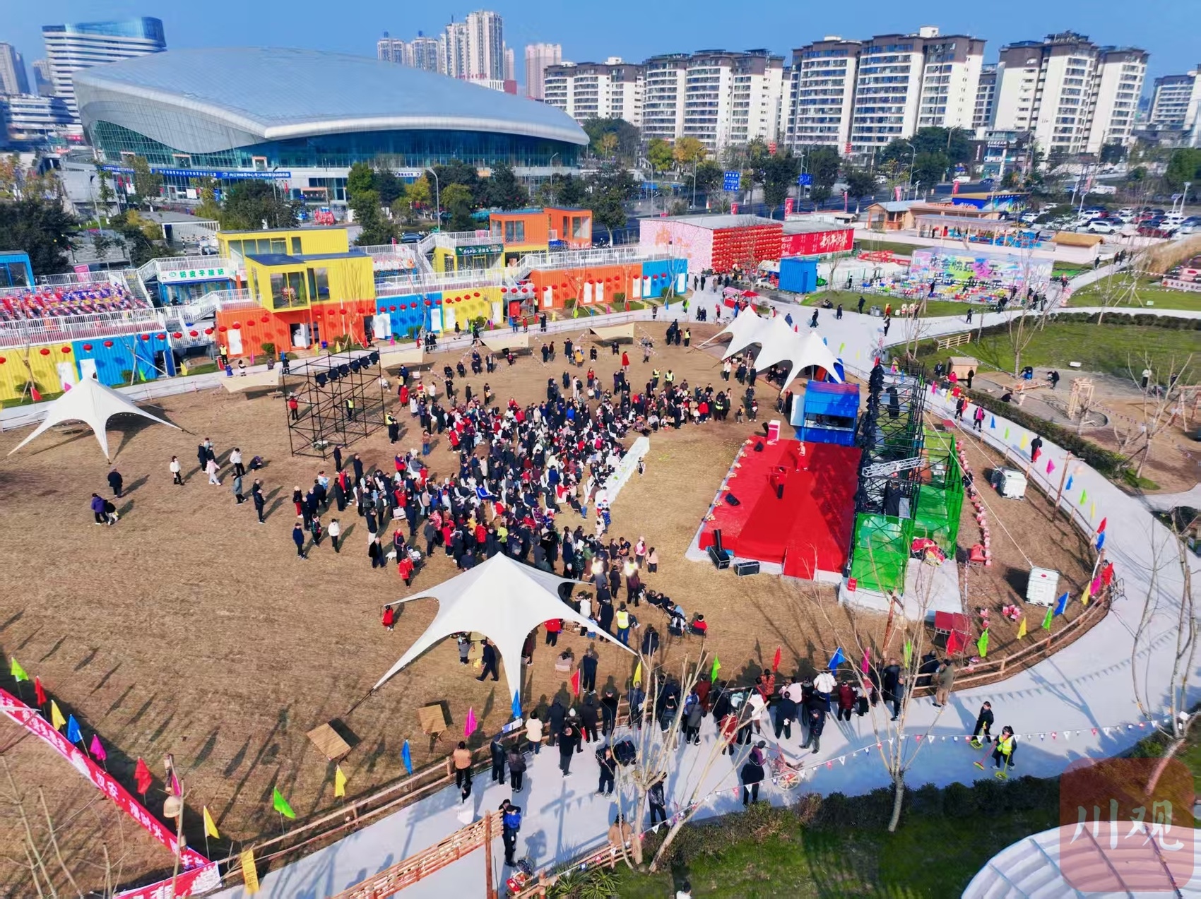 彩色的集装箱错落有致,草坪营地绿意盎然,火锅烧烤商铺在阶梯露台上层层叠叠,特色美食香飘四溢。11日,内江市东兴区复合型休闲空间“汉安·慢时光”正式对外开放,成为市民游客吃美食、晒太阳、看河景的新晋打卡地。