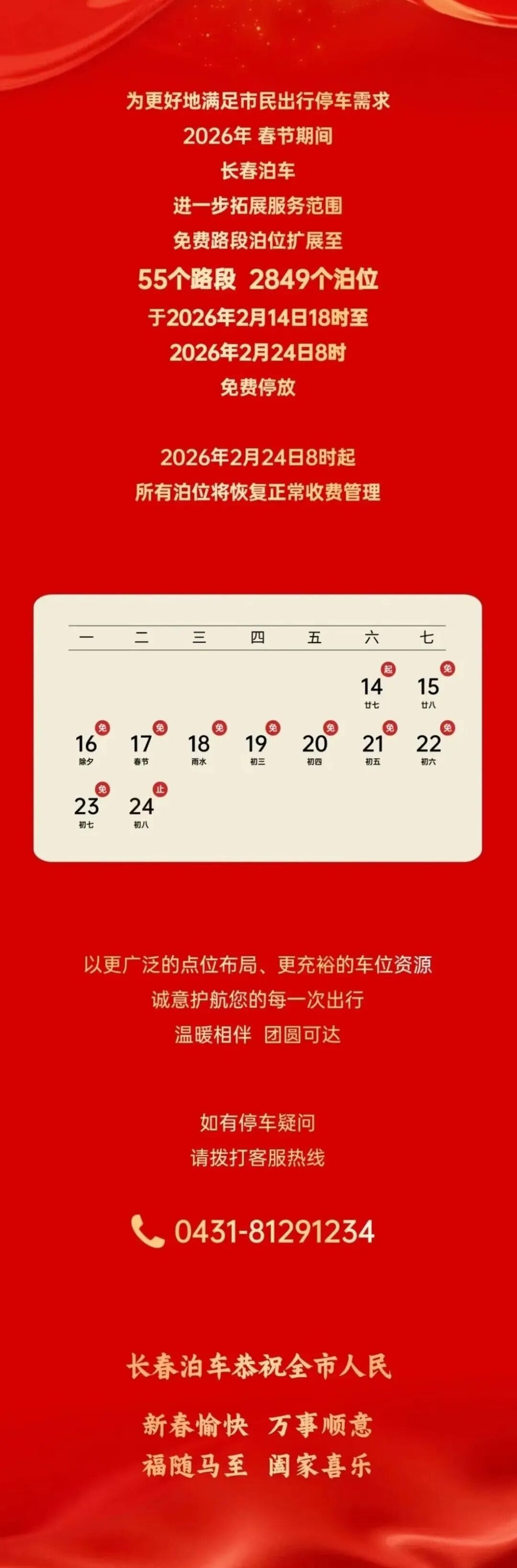 2月11日,长春泊车微信发布春节期间,长春2849个车位免费停车,详情如下: