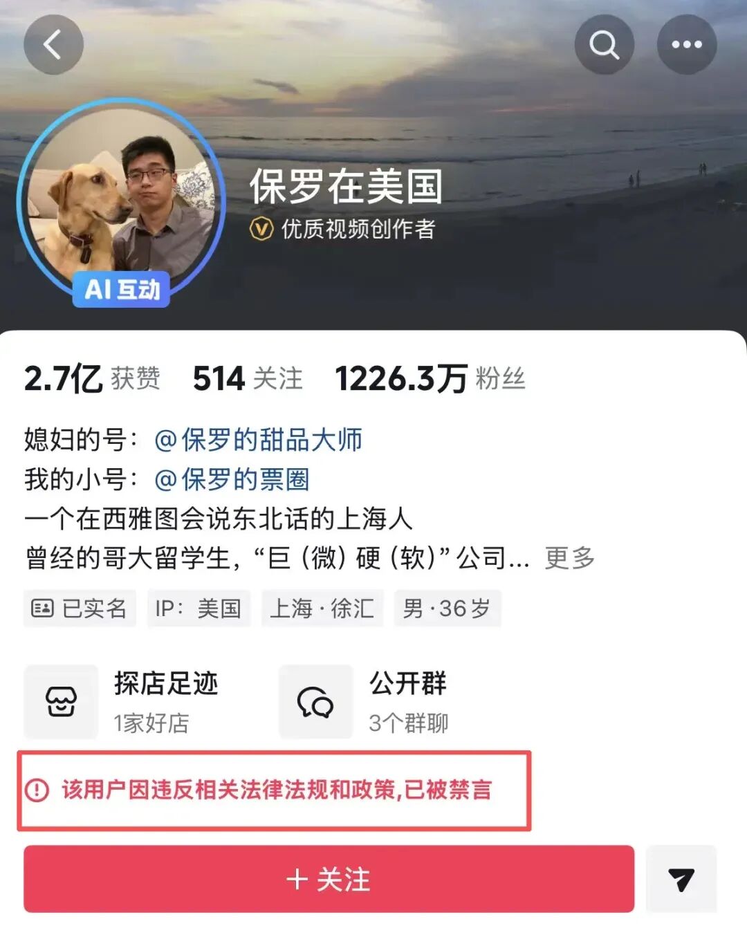 2月11日下午,记者发现,因晒妻子生产过程视频被质疑的千万粉丝博主“保罗在美国”已被平台禁言,其账号主页显示,该用户因违反相关法律法规和政策,已被禁言。