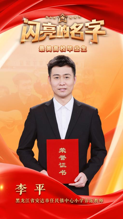 2月10日,中宣部、人力资源和社会保障部联合发布“最美高校毕业生”名单,黑龙江省绥化市安达市任民义务教育学校教师李平入选,成为全国9名入选者之一,也是此次评选中黑龙江省唯一获此殊荣的高校毕业生。《闪亮的名字——最美高校毕业生发布仪式》现场播放了“最美高校毕业生”先进事迹的视频短片,多角度讲述了他们的学习、工作方法以及生活感悟。