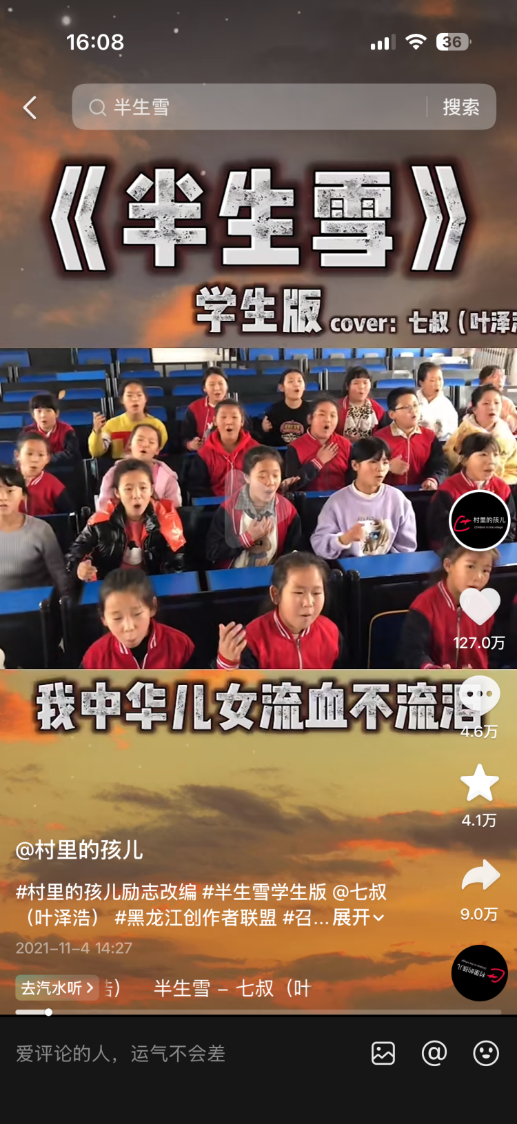 “村里的孩儿”歌声获得百万点赞。社交平台截图