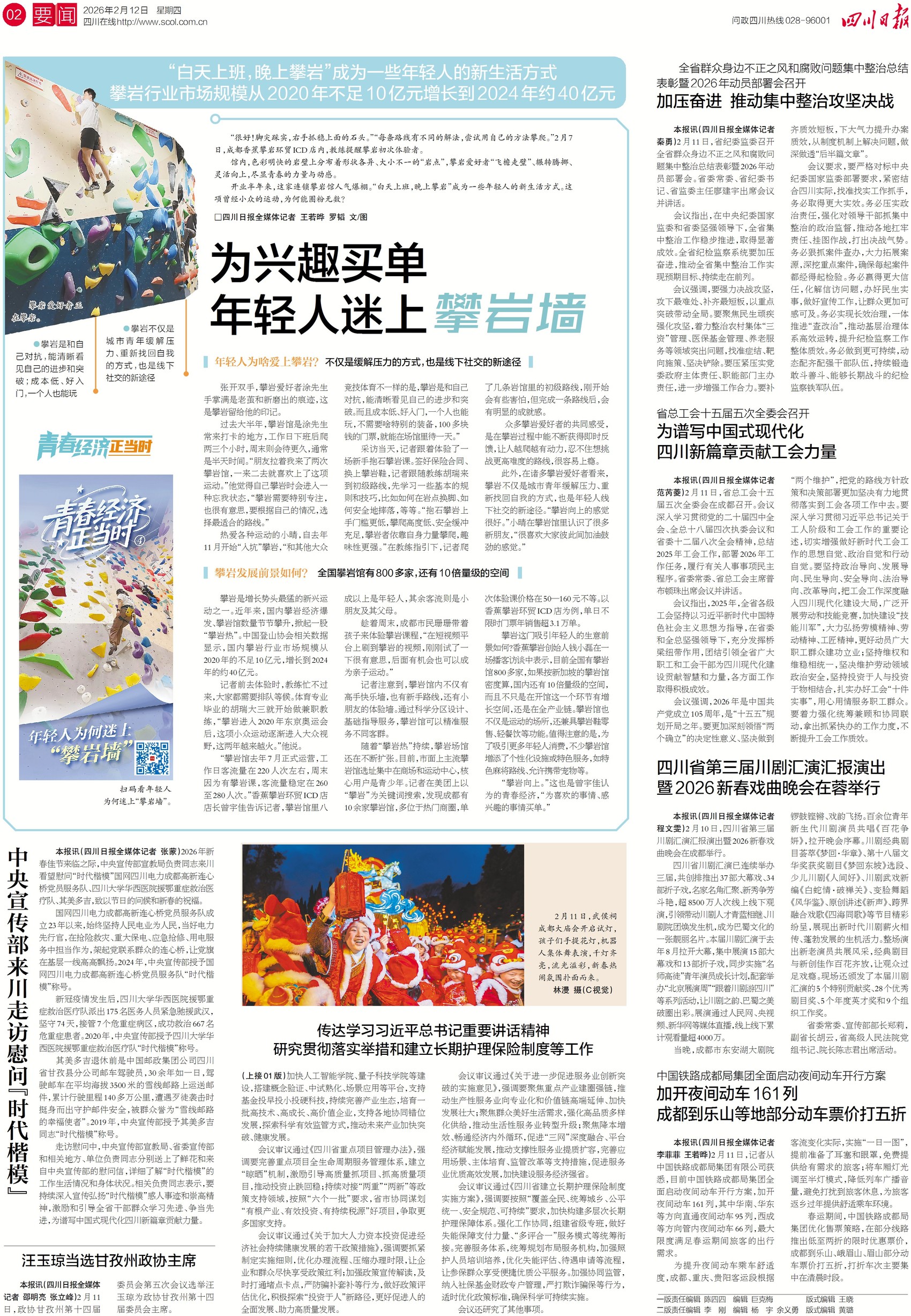 “白天上班,晚上攀岩”如今成了年轻人的生活新方式。它既能缓解紧张生活,也是线下社交的新途径。一些攀岩馆内,不仅有高手快乐墙,也有新手路线以及小朋友的体验墙。有的还兼具攀岩鞋零售、轻餐饮等功能,提供允许携带宠物等特色服务。据了解,目前全国攀岩馆有800多家,国内攀岩行业市场规模已从2020年的不足10亿元,增长到2024年的约40亿元。今日二版,看年轻人为何迷上“攀岩墙”。