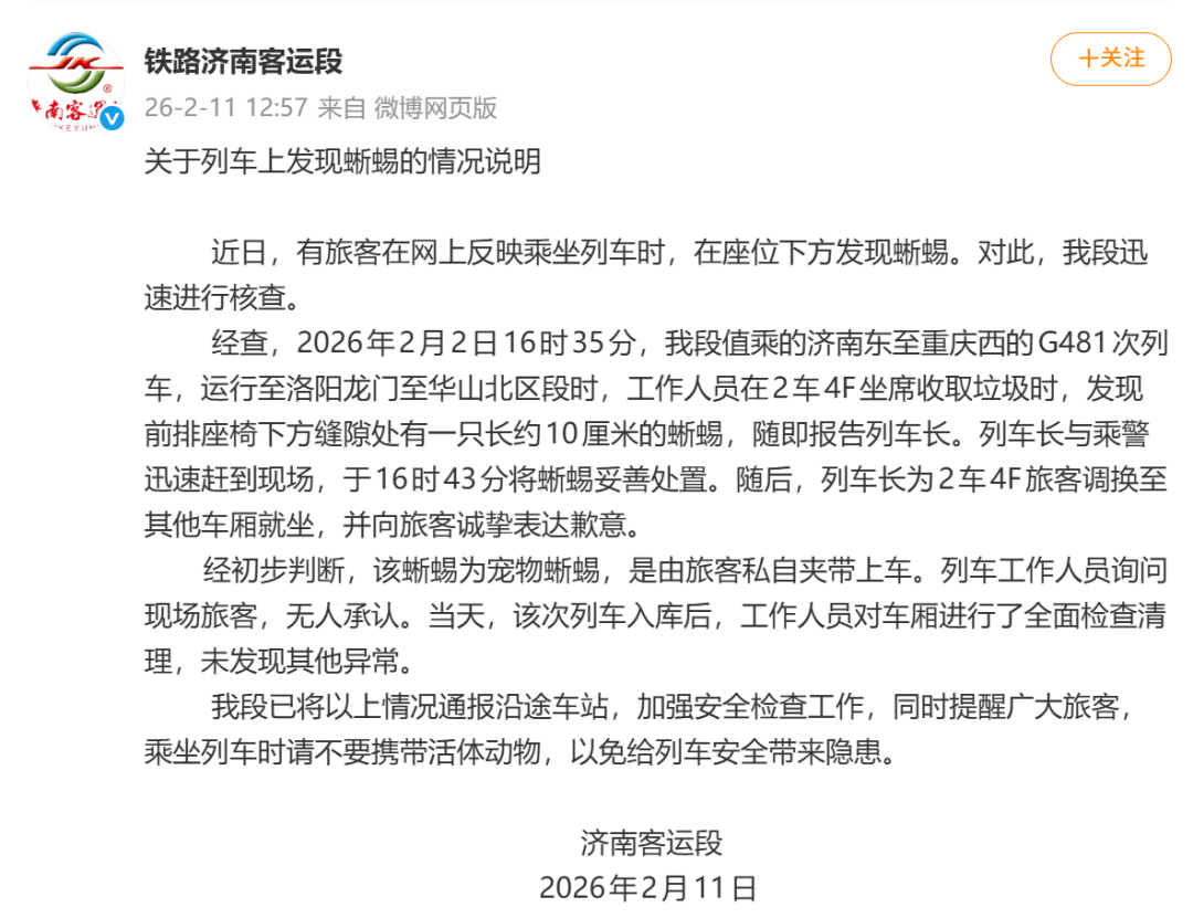 2月11日中午,@铁路济南客运段 发布关于列车上发现蜥蜴的情况说明,具体如下: