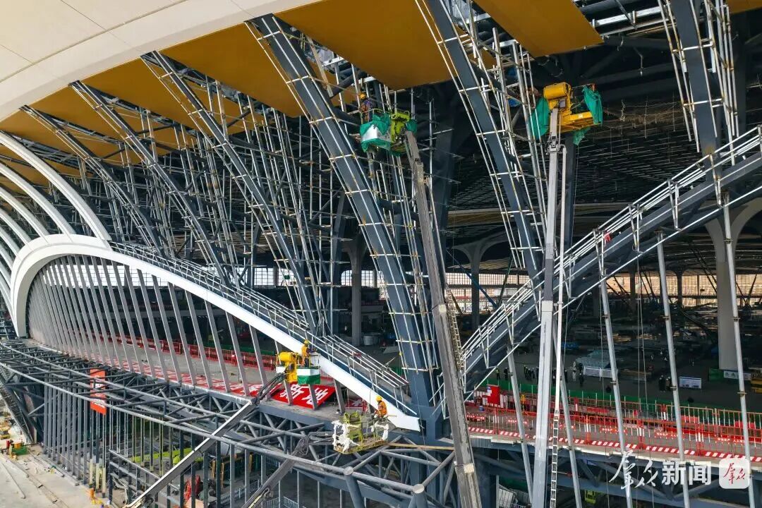 截至目前,已完成16万平方米混凝土结构、15000吨钢结构、7万平方米的金属屋面施工任务,为站房如期具备通车条件筑牢基础。”中铁建设项目总工程师刘健说。