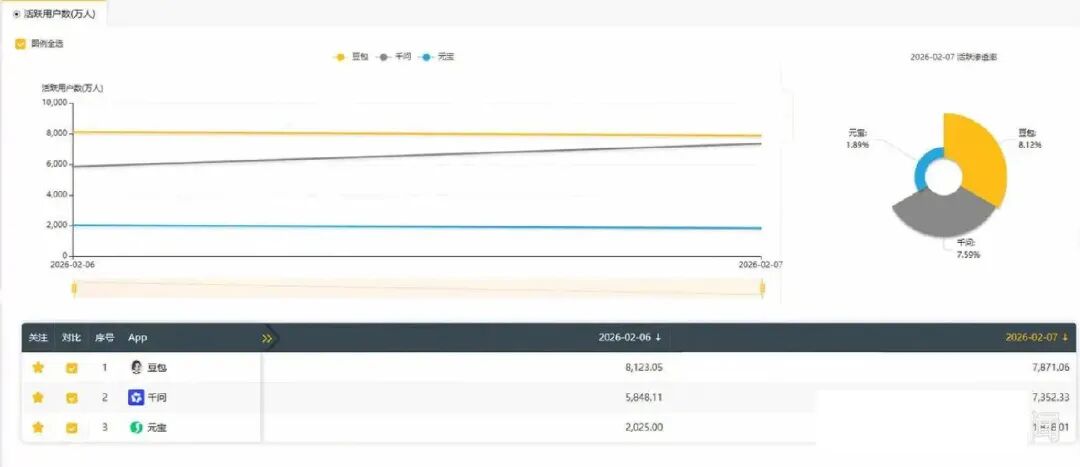 2月11日,QuestMobile的最新数据显示,2月7日,千问DAU(日活跃用户数)达到7352万,远超元宝DAU的1828万,逼近豆包DAU的7871万。