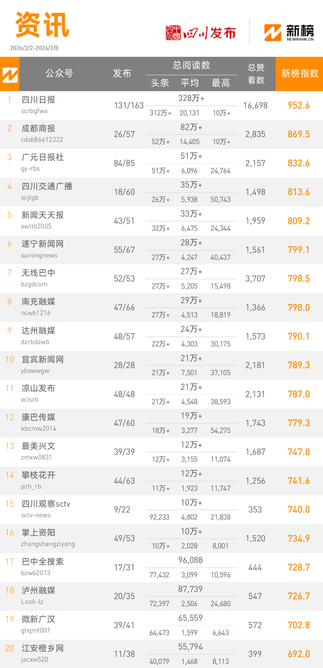 “四川日报”以3280000+次阅读量总数,952.6的新榜指数获得资讯类榜单第一名,“成都商报”本周以820000+次阅读量总数,869.5的新榜指数占据资讯类榜单第二名。