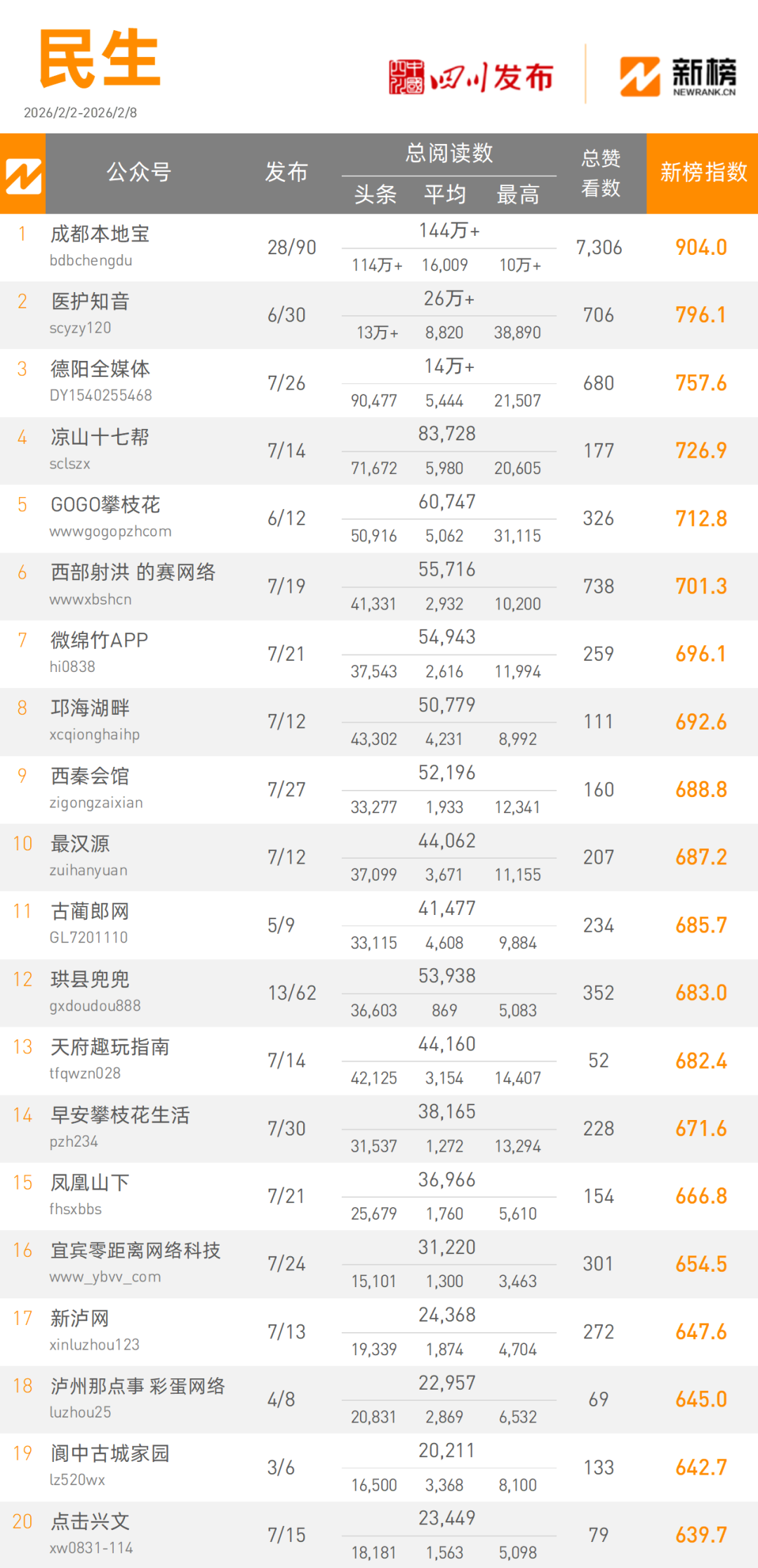 在本周市(州)榜单中,“成都发布”发文142篇,以6010000+次阅读量总数992.5的新榜指数摘得市州类榜单桂冠;“达州发布”发文49篇,以320000+次阅读量总数,809.2的新榜指数获得市(州)类榜单亚军。