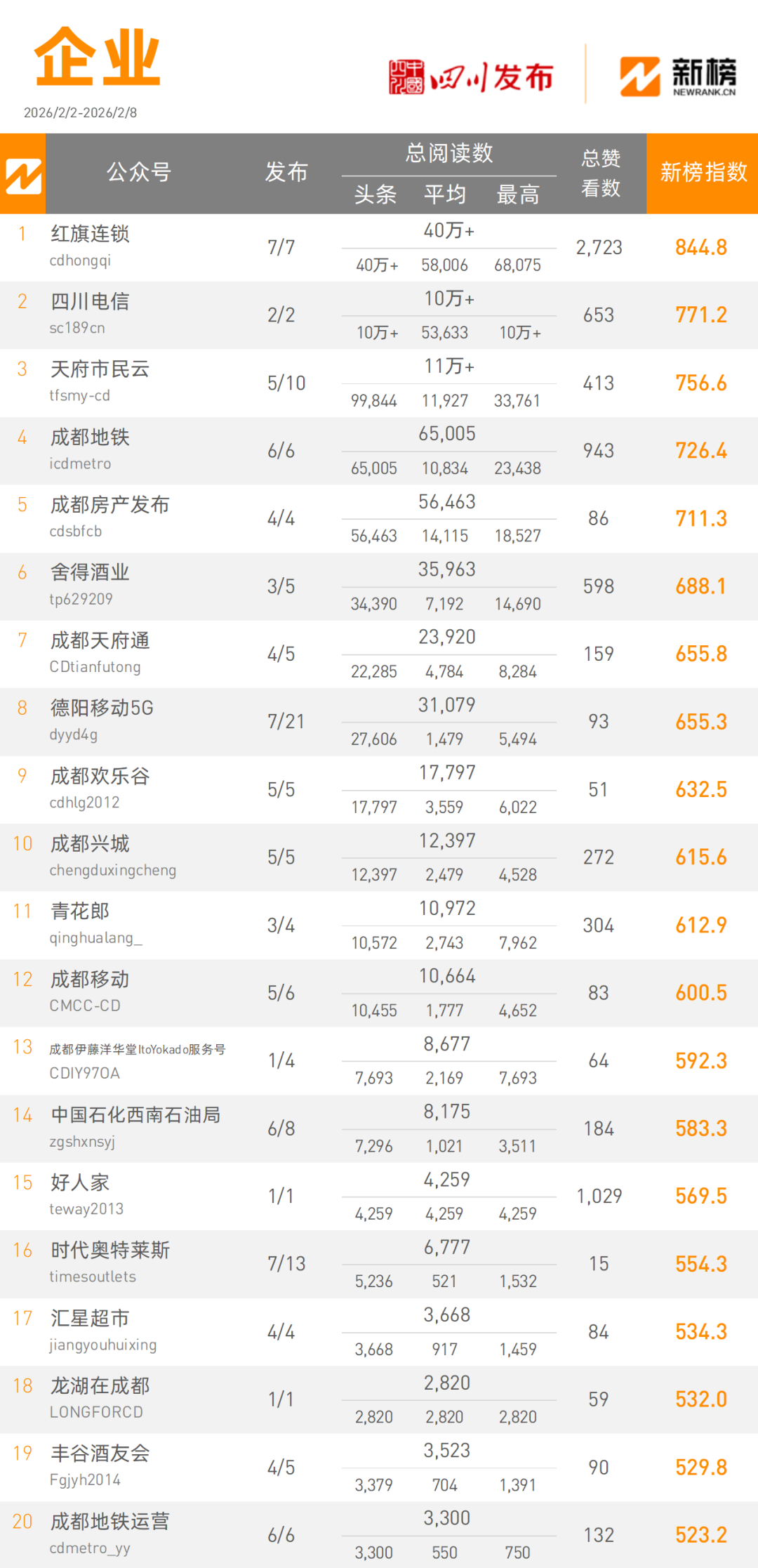 “红旗连锁”本周发文7篇,以400000+次阅读量总数坐上企业类榜单头把交椅,“四川电信”本周发文2篇,以100000+次阅读量总数位居企业类榜单次席。