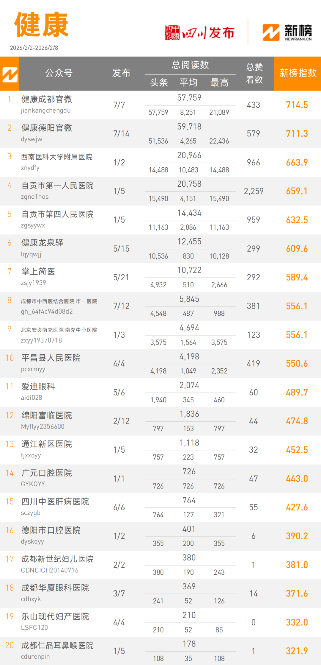 “健康成都官微”本周以57759次阅读量总数,714.5的新榜指数占据健康类榜单冠军宝座,“健康德阳官微”凭借59718阅读量总数,以711.3的新榜指数获得健康类榜单亚军。