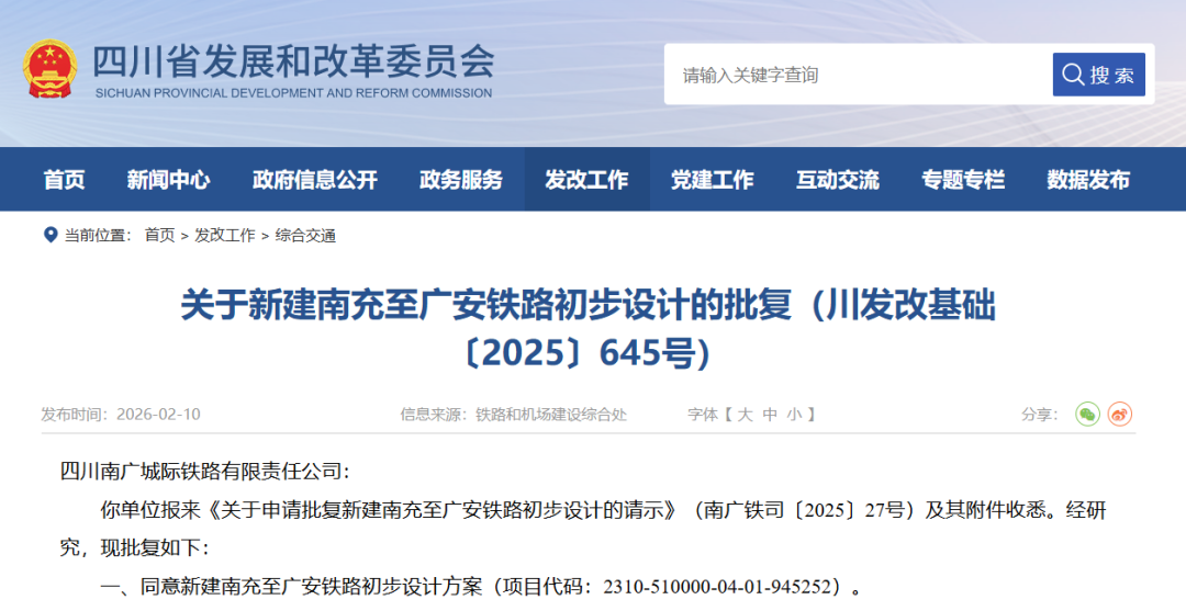 值得注意的是,新建南充至广安铁路项目站前工程已于近日发布招标公告,计划于今年4月开工,总工期48个月。