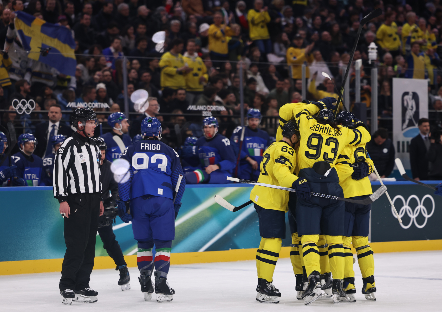 2月11日,瑞典队球员庆祝进球(瑞典队拥有众多北美职业冰球联盟现役球员)。新华社记者 王楷焱 摄