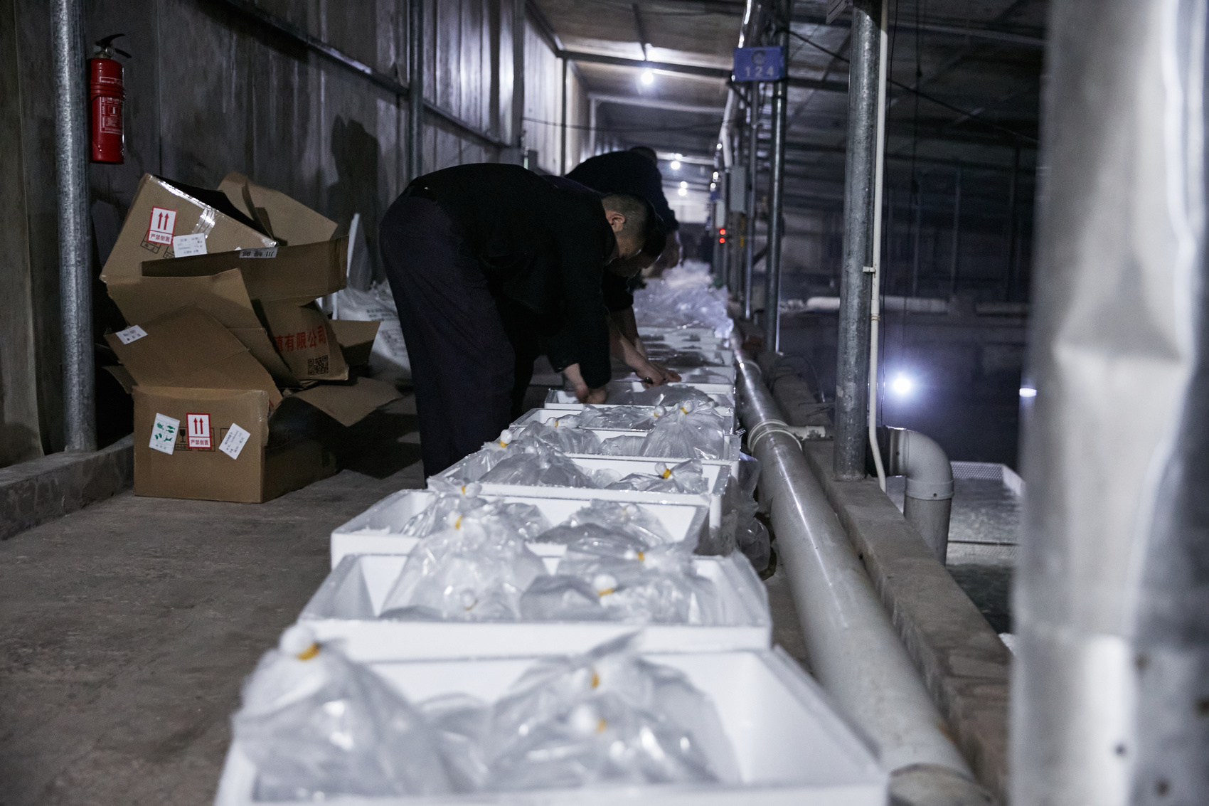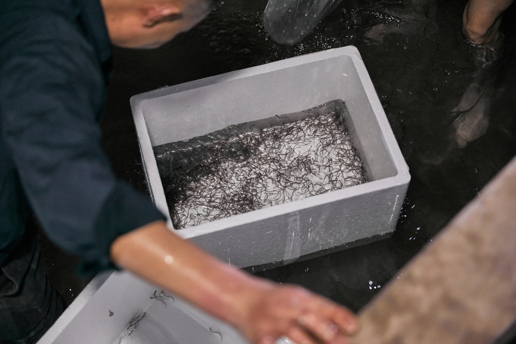 更棘手的是两次转运,从育苗场到机场,再从机场到基地,这两段陆运路程。“这期间,我们反复叮嘱司机,这些‘小东西’经不起颠簸。”当人员与鳗苗抵达江安时,魏森和团队已近二十四小时未合眼。“从验收、清点、充氧包装到入池,我们没停过,鱼苗也折腾了一路。”