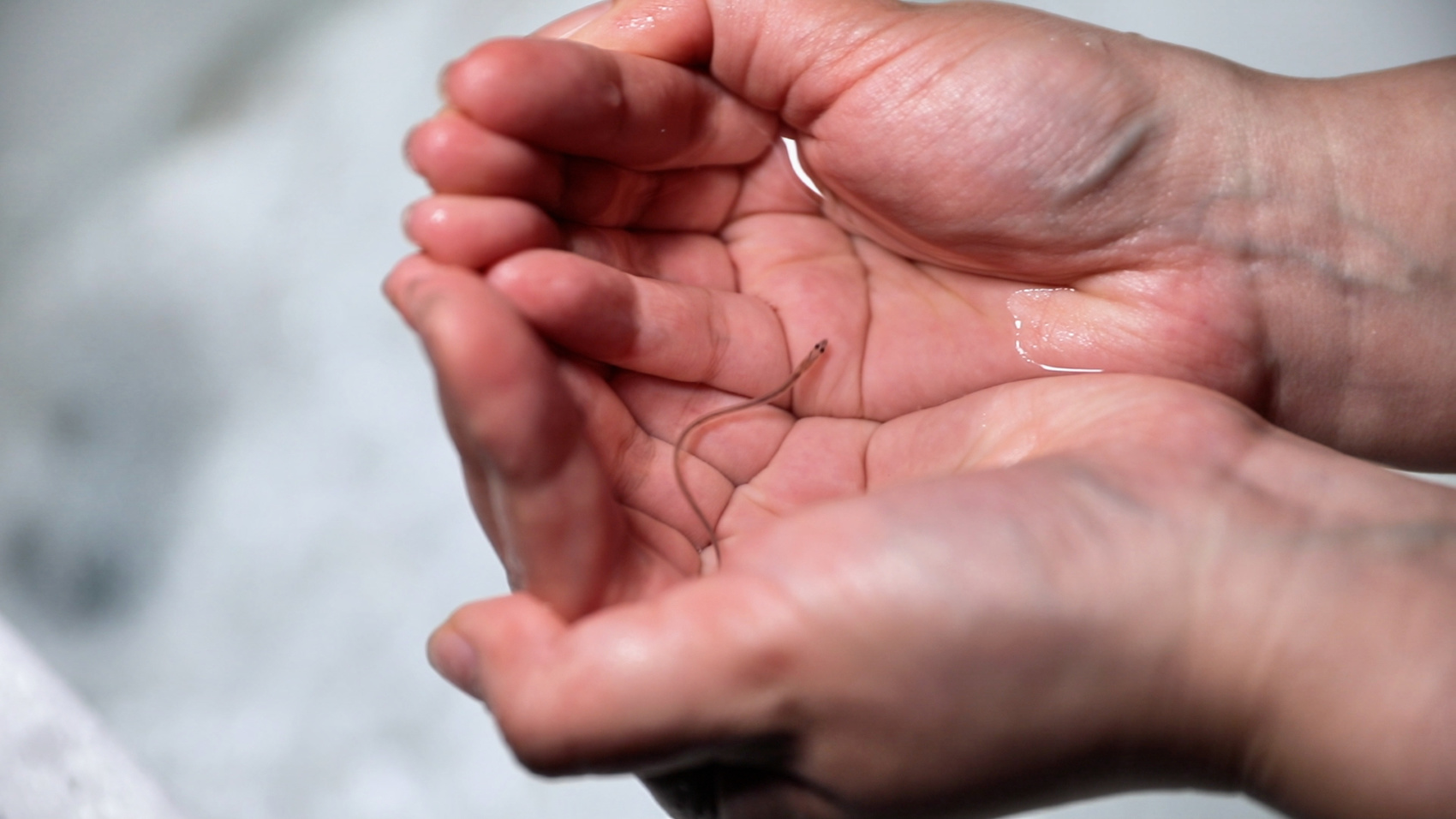 工作人员将一尾鳗鱼苗捧在手中。