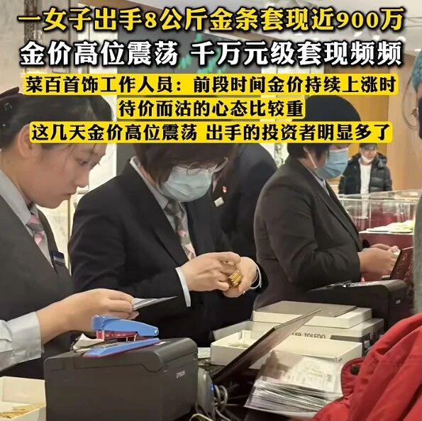 “这8公斤金条的回购价是1120元/克,扣除3.8元/克的手续费,一共套现近900万元。近期千万元级别套现的投资者每天都有,8公斤并不是最多的,他们大多是前些年陆续购入的投资金条。前段时间金价持续上涨时,待价而沽的心态比较重,这几天金价高位震荡,出手的投资者明显多了。”菜百首饰工作人员对记者表示。