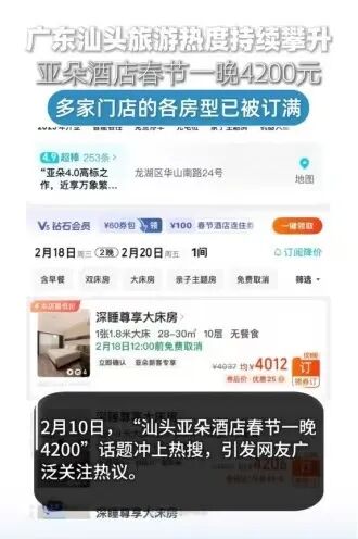 近日有网友反映,春节期间广东汕头酒店普遍涨价,平时720元左右的汕头万象城亚朵酒店深睡尊享大床房,春节价格涨至4221元。“汕头4200元一晚的亚朵已订满”等词条登上热搜。