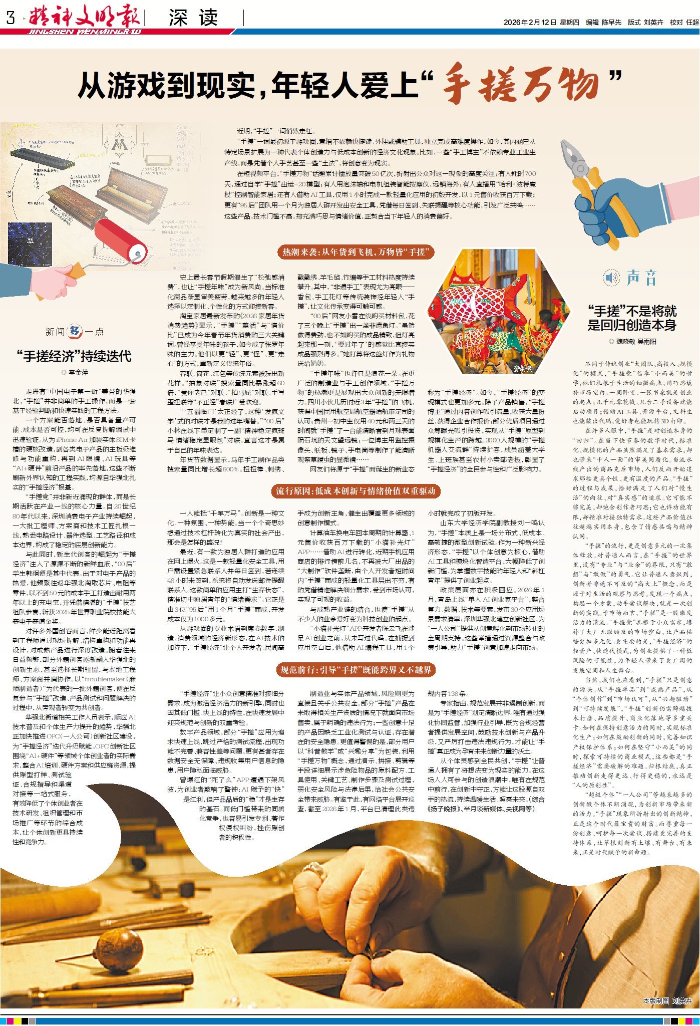从游戏圈的专业术语到席卷数字、制造、消费领域的经济新形态,在AI技术的加持下,“手搓经济”让个人开发者、民间高手成为创新主角,催生出覆盖更多领域的创意制作模式。