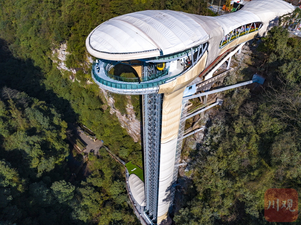 作为碧峰峡打造的重点项目,新青云梯在原有电梯基础上新增三部高速观光电梯,单轿厢可容纳21人,三台同步运行每小时可运送1300名游客,彻底告别旅游旺季排队难题。103米的垂直高度,仅需30秒即可从谷顶直达谷底,3.5米/秒的运行速度让高效通行成为常态,更实现了“通行即观景”的沉浸式体验——熊猫主题全玻璃轿厢,将峡谷瀑布、溪流林海尽收眼底,让游客在移动中饱览自然之美。