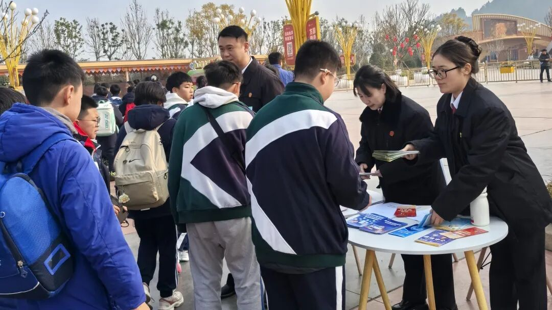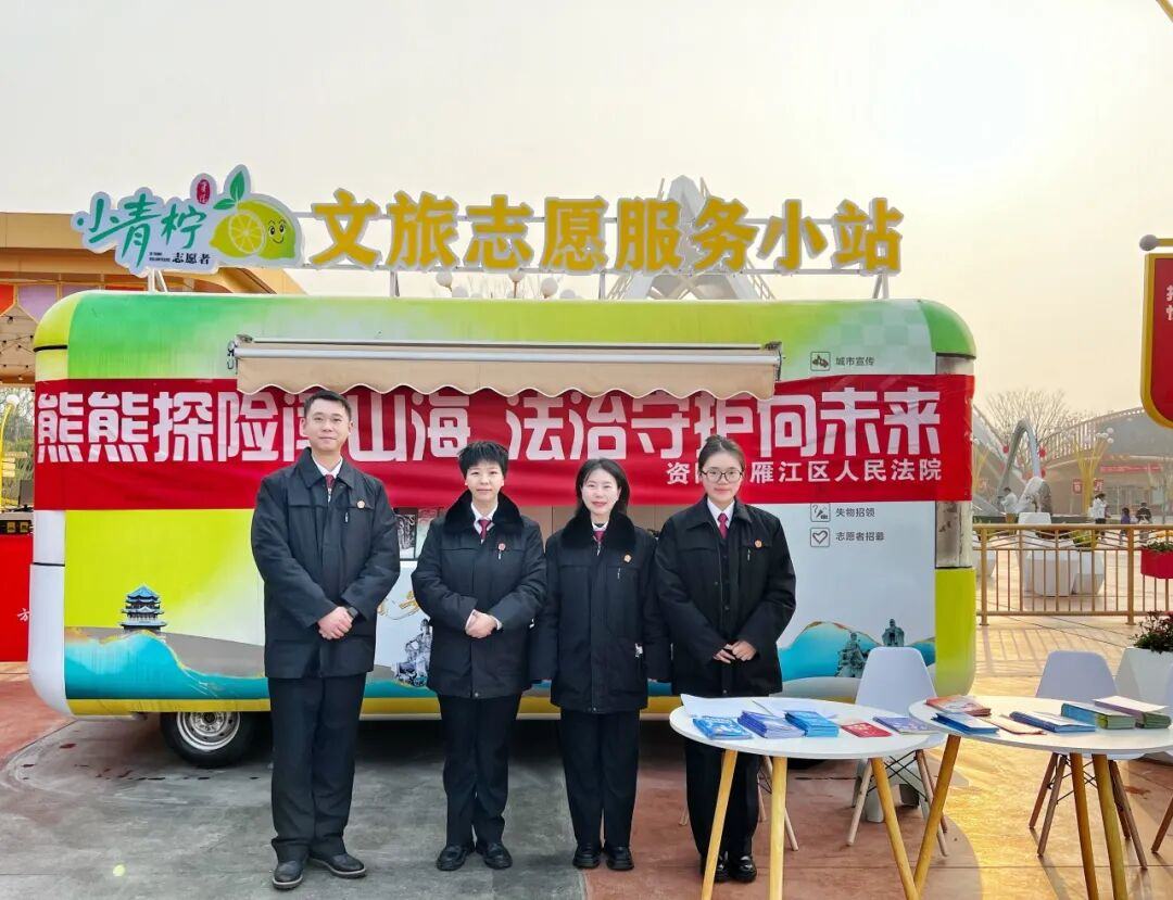 春节来临,四川省冬季旅游季热度攀升,资阳方特璀璨启幕,八方游客齐聚“成渝文旅新地标”,共赴一场新春欢乐之约。为推动“冬游四川·司法同行”专项行动落地见效,2月5日,资阳市雁江区人民法院行政庭与民事审判第一庭联合组队,以“摆摊设点”的接地气形式,开展专项法治宣传活动。活动现场,“熊熊探险闯山海 法治守护向未来”的宣传横幅醒目悬挂,与园区欢乐活泼的氛围相映成趣,吸引大量游客驻足。