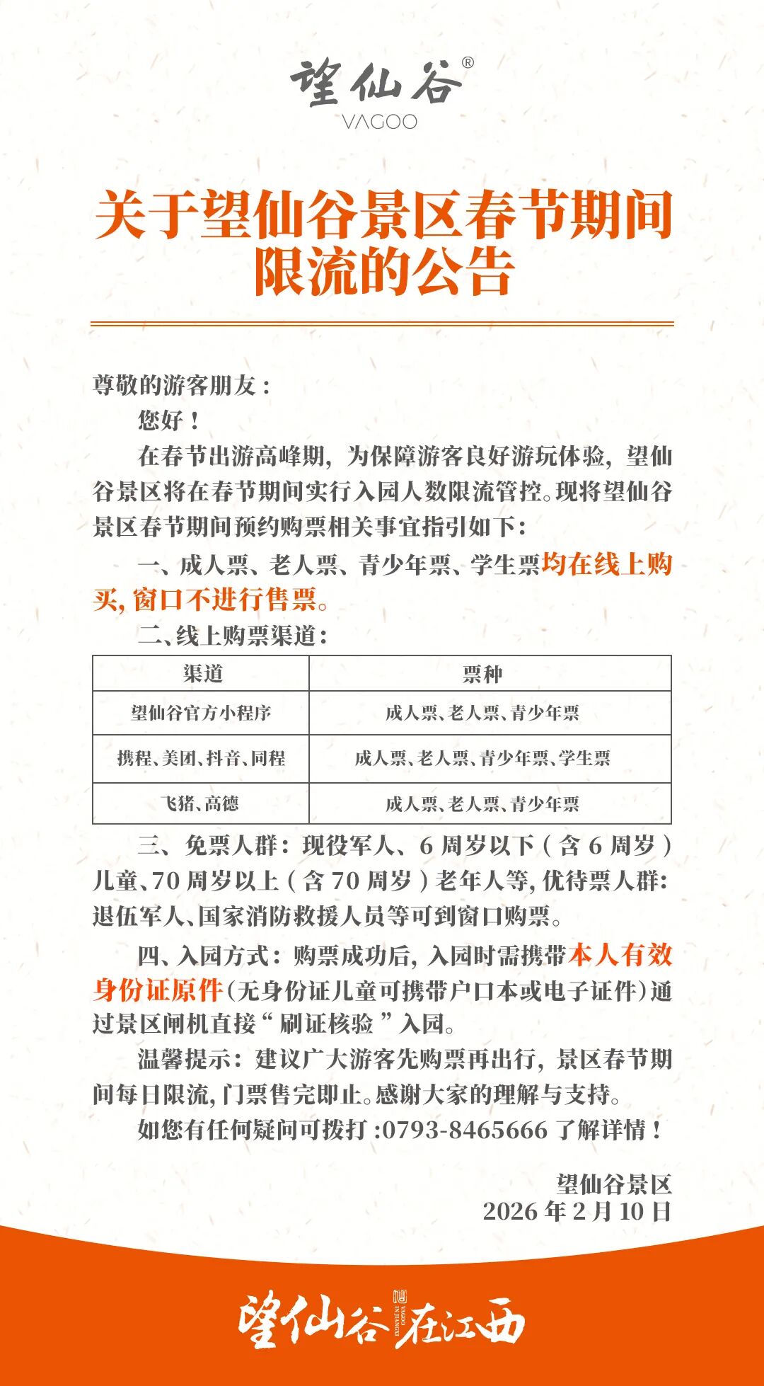 江西望仙谷景区将在春节期间实行入园人数限流管控,成人票、老人票、青少年票、学生票均在线上购买,窗口不进行售票。建议广大游客先购票再出行,景区春节期间每日限流,门票售完即止。