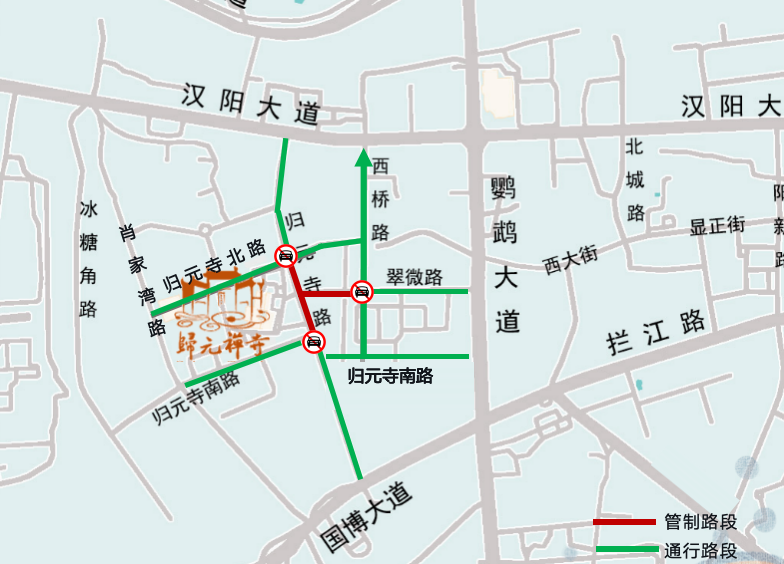 2月18日(初二)、2月19日(初三)、2月20日(初四)、2月22日(初六)、2月23日(初七)每日7:00至17:00,归元寺路(归元寺南路至归元寺北路)、翠微路(归元寺路至西桥路)禁止机动车及非机动车通行和停放。