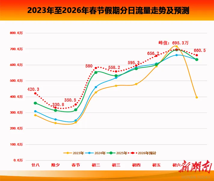 路网主要以小型客车为主(占比97%以上),在“四纵四横”高速主干道及“3+5”城市圈周边形成明显的潮汐性、波段性路网运行特征。预计正月初五至初七为返程集中时段,潮汐方向主要为由北向南、由西向东,部分路段易发缓行或拥堵。其中2月22日(正月初六)达695万辆,为假期最高峰,建议公众提前规划路线,主动错峰出行。