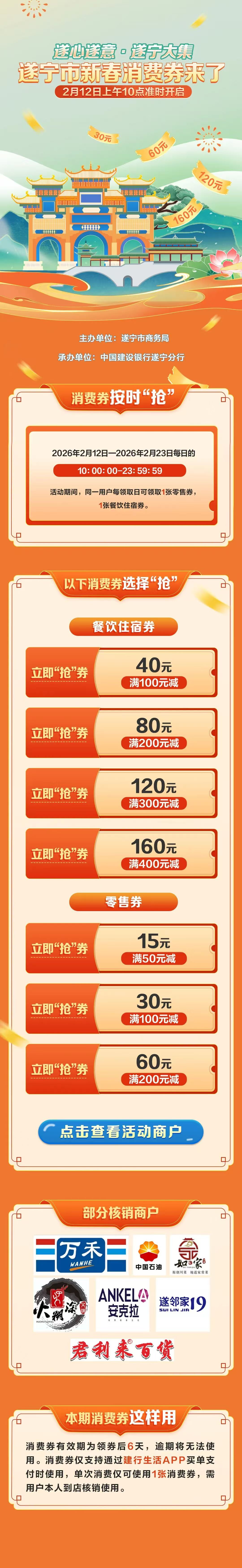 每日上午10:00至23:59,市民、游客可通过“建行生活”APP,在“遂心遂意·遂宁大集”新春消费券专区实名认证后领取。每人每天每类消费券限领1张,各类券数量有限,先到先得,领完即止。