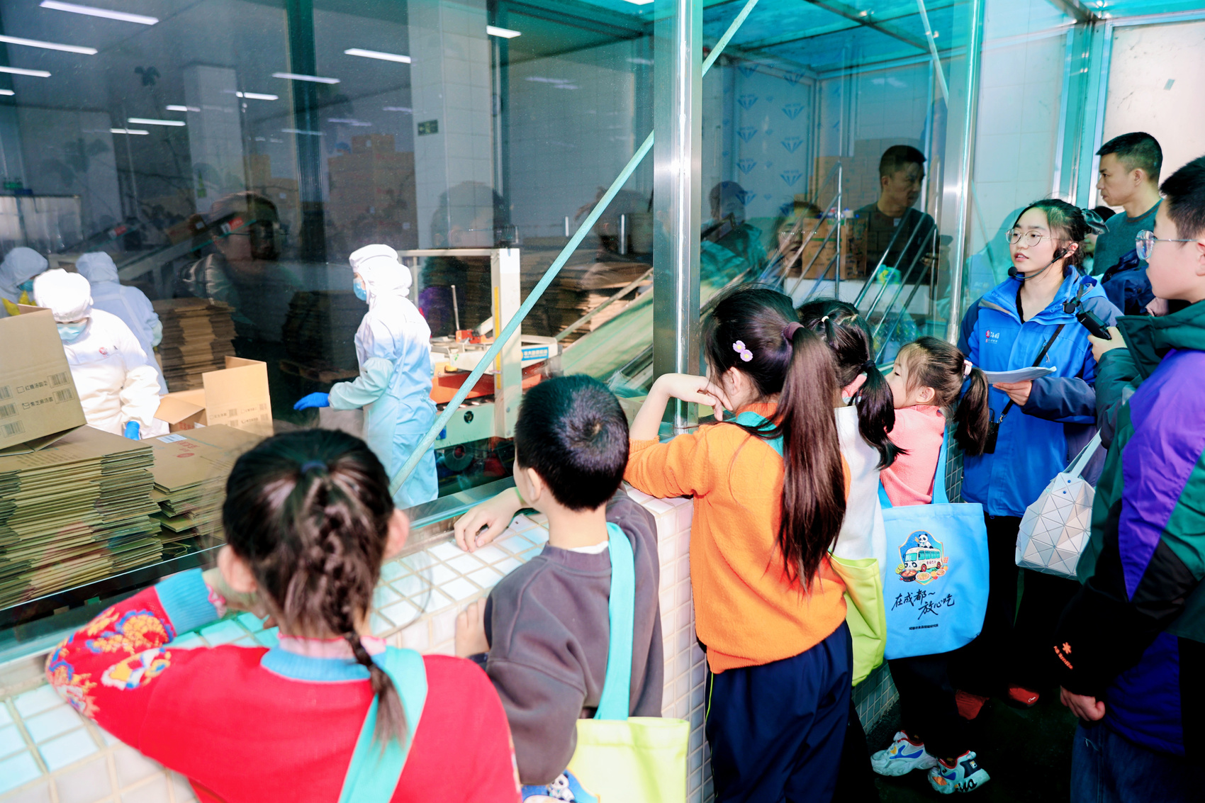 透过玻璃窗,可见流水线上汤圆如珠玉般滚动,几名小学生“食安体验官”正认真数着:“十颗、二十颗、三十颗……”